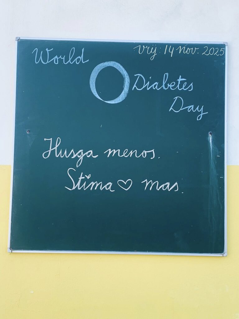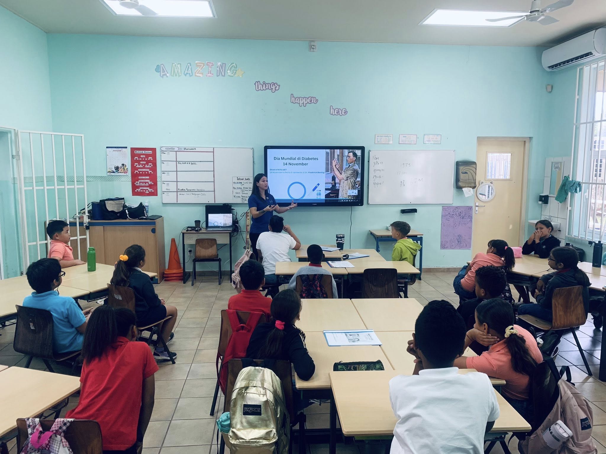 Dia Mundial di Diabetese, Aruba One Happy Island Lions Club, den colaboracion cu POH (Praktijkondersteuners Huisartsenzorg) a brinda un charla educativo y interactivo na St. Dominicus College. Un grupo grandi di studiante a participa y a pone bon atencion durante tur e presentacion.