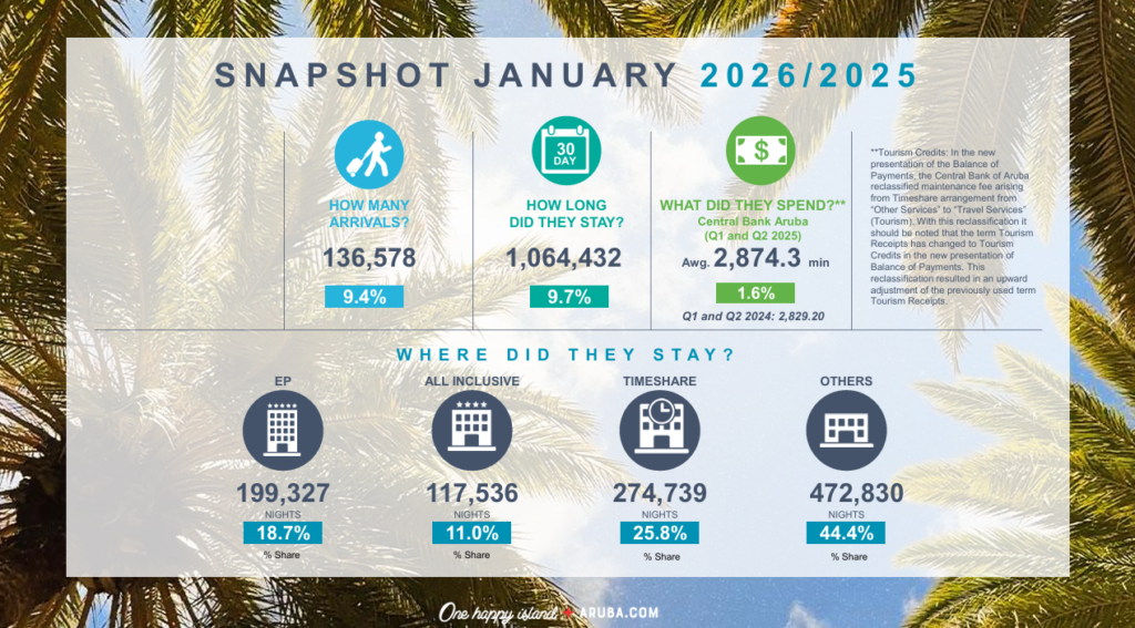 E panorama di turismo pa januari 2026 ta mustra un combinacion solido di yegadanan, estadia prolonga y un mescla amplio di mercado. Aruba a ricibi un total di 136.578 bishitante stayover, mientras cu e cantidad total di nochinan di estadia a yega 1.064.432, resultando den un promedio di estadia, esta Average Length of Stay (ALOS) di 7.8 anochi, un cifra cu ta refleha un nivel mas halto di compromiso y interaccion cu Aruba como destinacion.