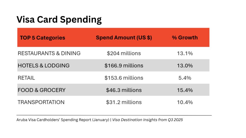 Durante 2025, Aruba a registra 1,028,071 Visa cardholders di 152 pais, cu a genera un total di USD 696 miyon den gasto. Esaki ta mustra un patronchi di gasto amplio, unda tanto cardholders como transaccionnan a sigui subi na ritmo saludabel.