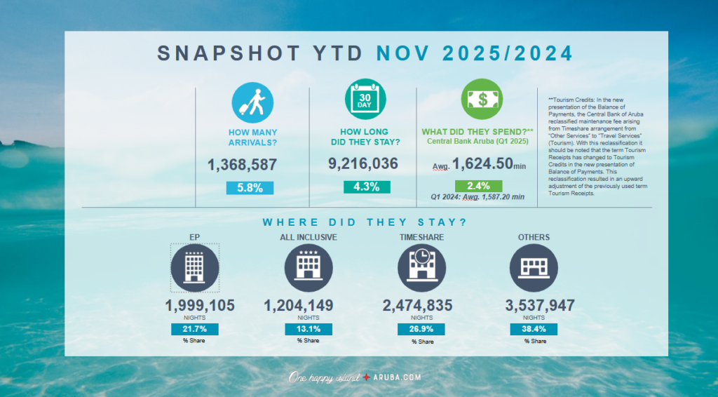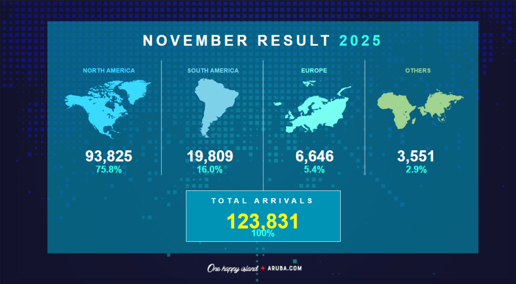 Durante november 2025, Aruba a ricibi un total di 123,831 turista stay-over, representando un crecemento di 15.9% compara cu november 2024. Esaki ta un aumento absoluto significativo. E aumento mas notabel a bini for di mercado Latino Americano, particularmente Argentina y Brasil. For di Norte America, Canada a sigui contribui den e crecemento general.