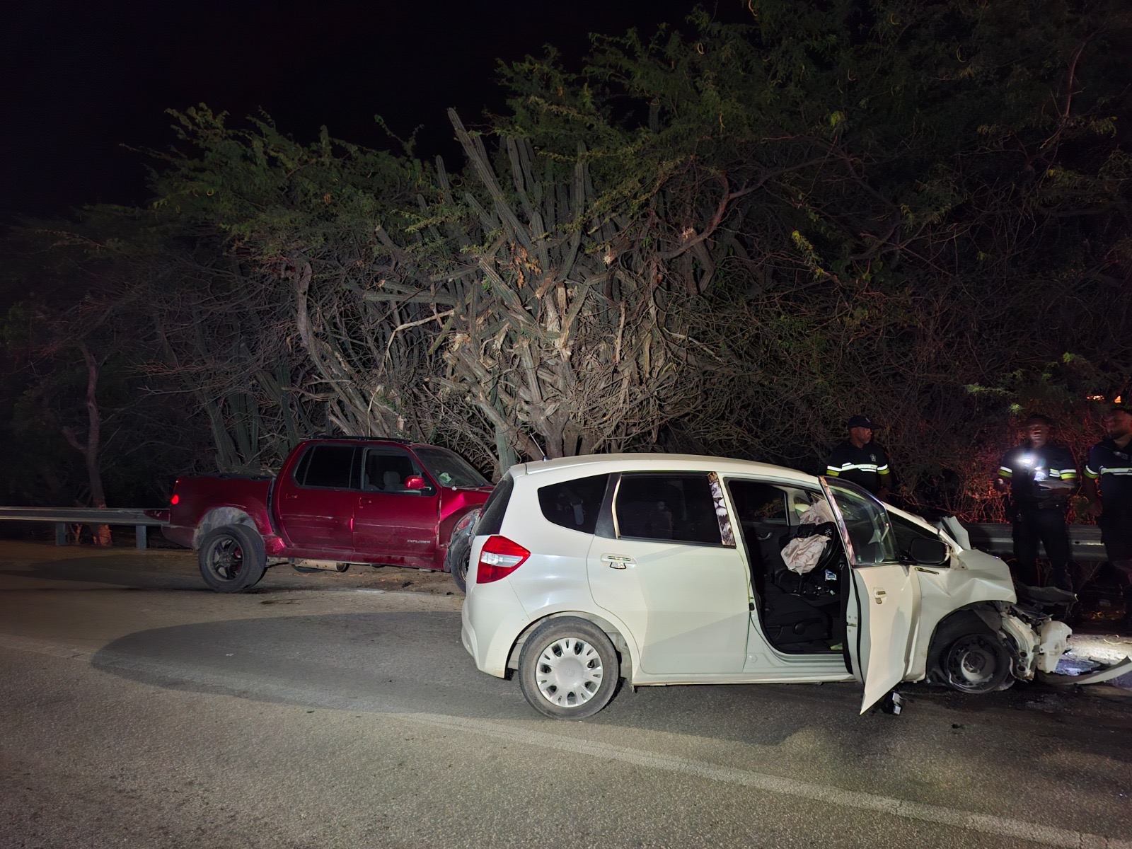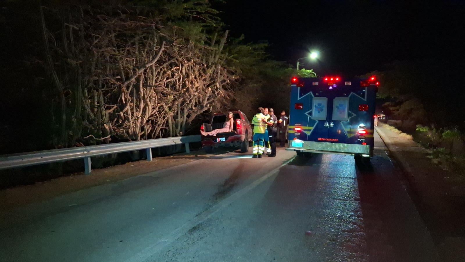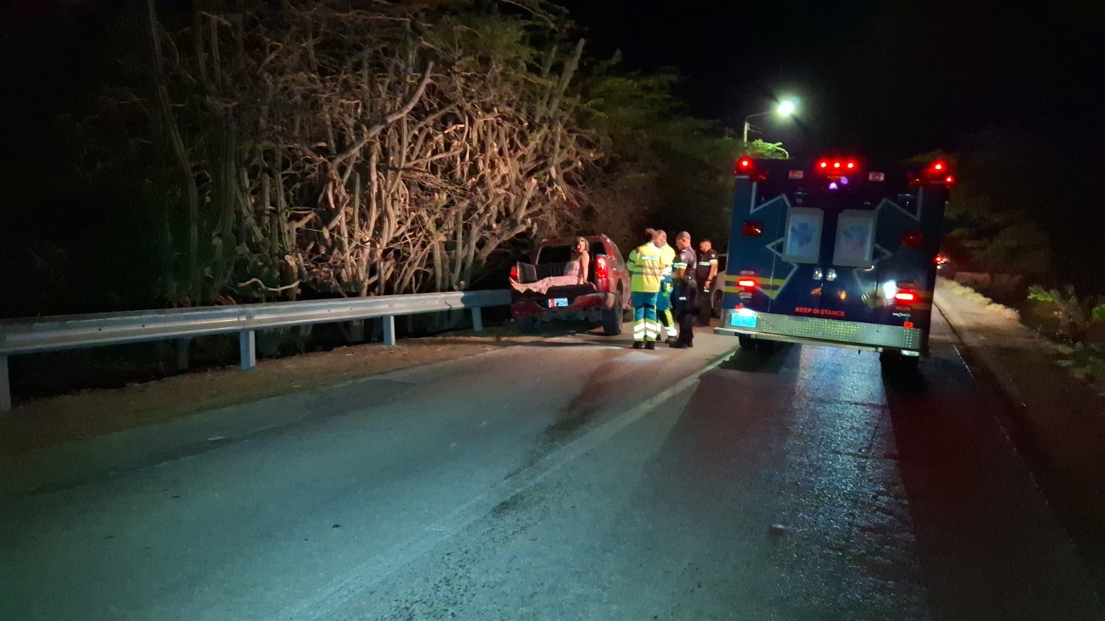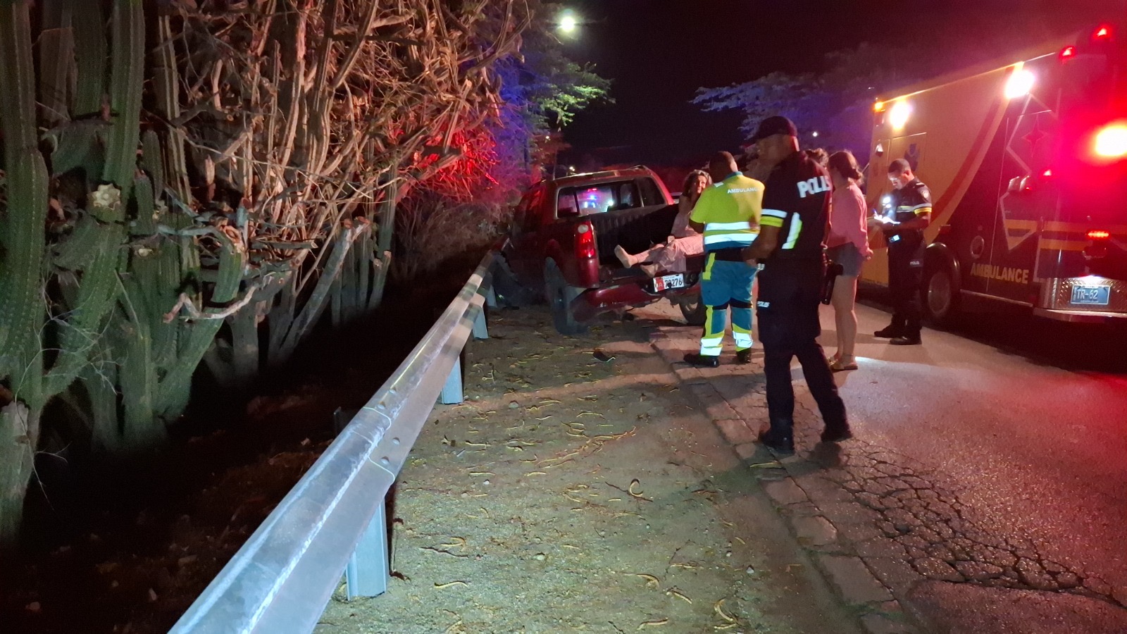 Diabierna anochi a drenta informe di un accidente cu hende herida na e birada riba e caminda di Noord pa Sabana Liber, mesora a dirigi tanto polis como ambulans na e sitio. Na yegada di e patruya a bin compronde cu aki ta trata di un accidente unda cu un pick-up maneha pa un chauffeur posiblemente bao influencia a perde control a dal un Honda Accord shinishi y despues bay dal frontal riba un Honda Fit blanco y finalmente bay dal riba e “vangrails”. Debi na e fuerte impacto un dama pasahero turista den e pick-up a resulta herida, na yegada di e ambulans nan a atende e dama turista pero como cu e no kier paga nan no a transporte pa hospital. Un rato despues un familiar di e turista a yega y a transporte pa hospital. Polis a detene e chauffeur pa a core auto bao influencia.