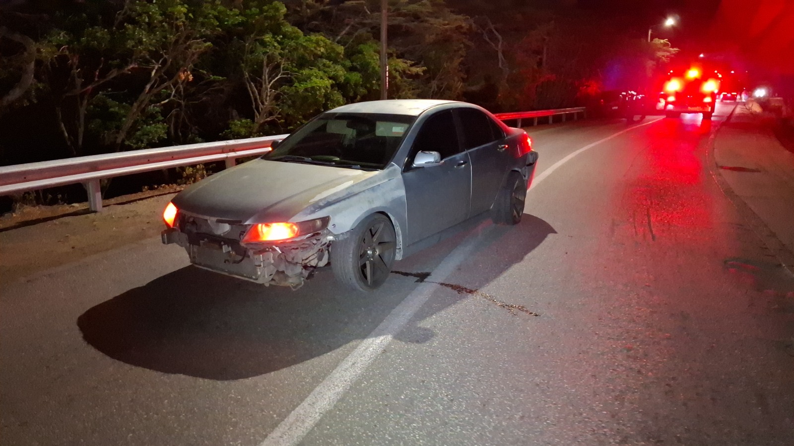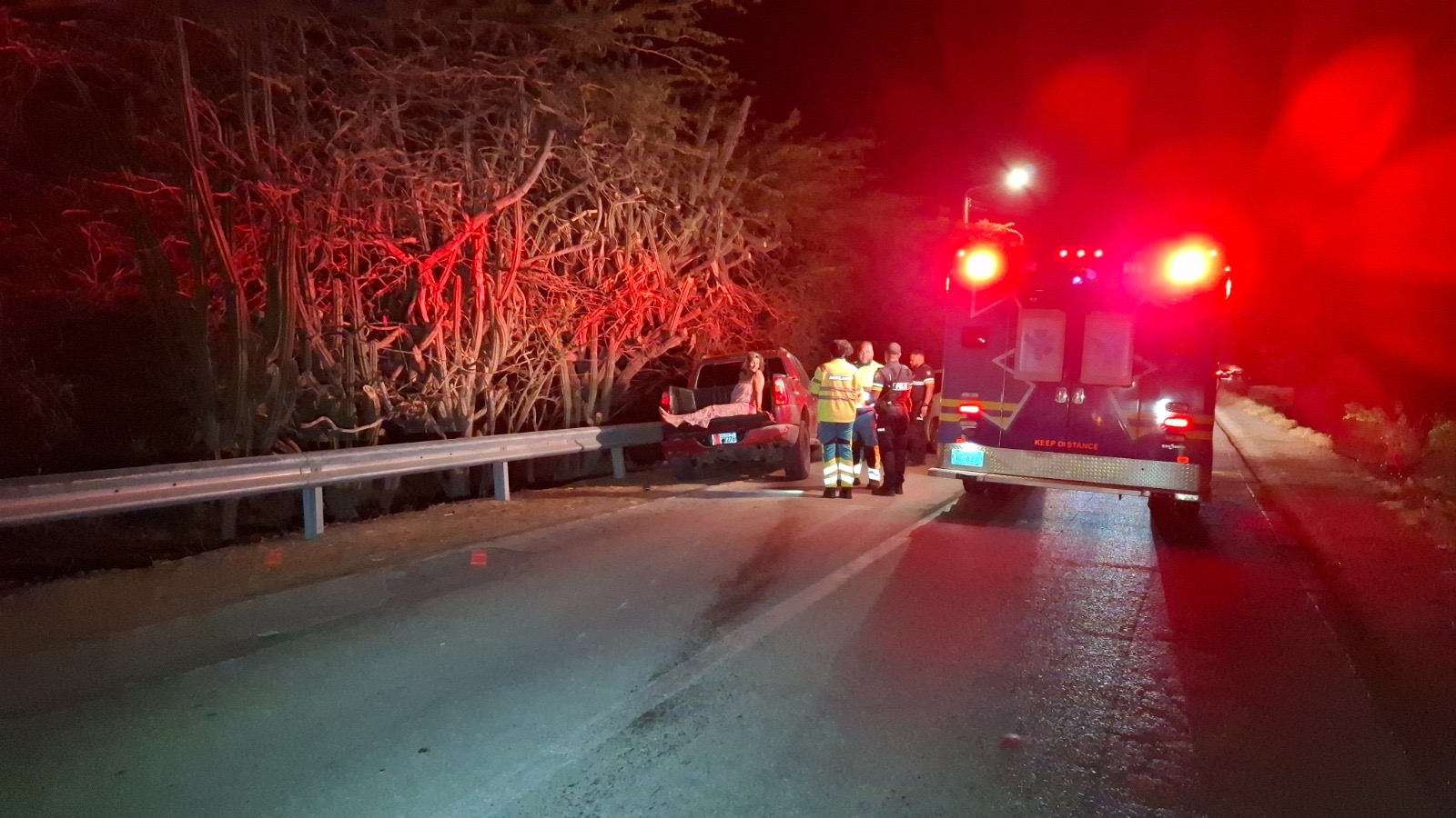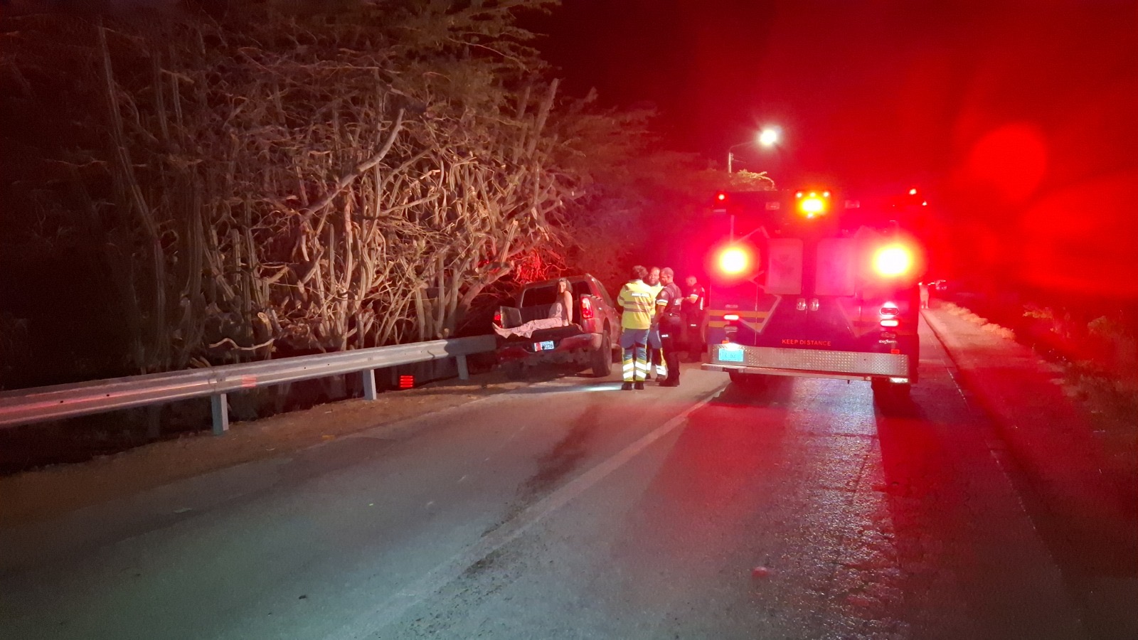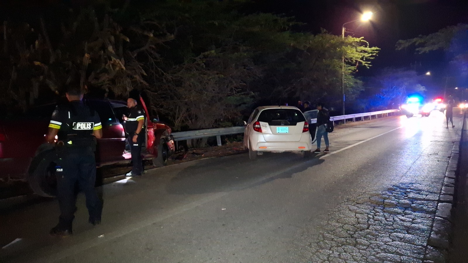 Diabierna anochi a drenta informe di un accidente cu hende herida na e birada riba e caminda di Noord pa Sabana Liber, mesora a dirigi tanto polis como ambulans na e sitio. Na yegada di e patruya a bin compronde cu aki ta trata di un accidente unda cu un pick-up maneha pa un chauffeur posiblemente bao influencia a perde control a dal un Honda Accord shinishi y despues bay dal frontal riba un Honda Fit blanco y finalmente bay dal riba e “vangrails”. Debi na e fuerte impacto un dama pasahero turista den e pick-up a resulta herida, na yegada di e ambulans nan a atende e dama turista pero como cu e no kier paga nan no a transporte pa hospital. Un rato despues un familiar di e turista a yega y a transporte pa hospital. Polis a detene e chauffeur pa a core auto bao influencia.