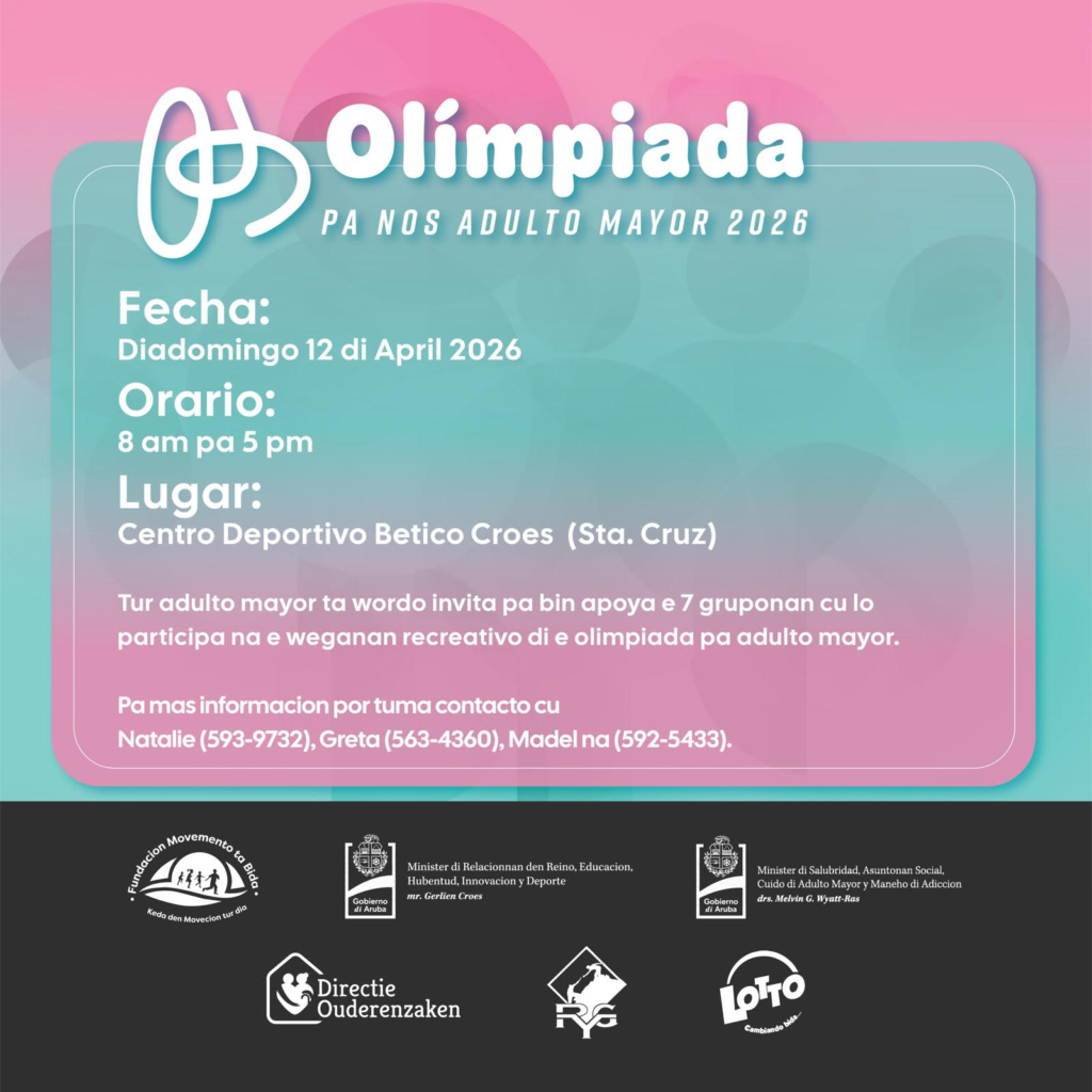 Lotto pa Deporte cu Minister Sra. Gerlien Croes a wak mesora un bon oportunidadpaorganisa un evento asina pa nos Adultonan Mayor na Aruba. E weganan ta recreativoy7 grupo di adulto mayor na Aruba lo ta participando pa prome biaha. E gruponanloparticipa cu entre 20 a 25 persona den 7 wega totaal. E actividad aki ta tuma lugadiadomingo 12 di April, na Centro Deportivo Betico Croes na Sta. Cruz y ta cuminsa8am y termina 4pm. Tur team tin un otro color di tshirt e 7 gruponan ta: Flor di Aloë(Dakota), Honey Bees (Dakota), Happy Hearts (Sta. Cruz), Rise and Shine (SanNicolas), Curason Jong (Paradera), Sigui Move 60plus (Noord) y Club Kibrahacha(Paradera). Cu ta un total di 159 participante. Tur grupo ta entusiasma y den training, pasobra e ganador absoluto lo por biaha na Juni pa competi na Boneiro. Aribaediadi Olimpiada nos lo tin hopi boluntario cu lo yuda FMTB cu e programa. Na final oradi entrega di premio y medaya e banda Kibrahacha Boyz lo trece ambiente. EpromeOlimpiada pa nos Adulto Mayor ta dedica na Sra. Edna Maduro, como e ateletacuatrece e prome medaya di oro pa pais Aruba den aña 1993 na wega CAC(PuertoRico). Fundacion Movemento ta Bida ta invita tur adulto mayor, famia y amigonan di etur eparticipantenan di e gruponan ariba menciona, pa bin bin apoya nos adulto mayor aribadiadomingo 12 di April na Centro Deportivo Betico Croes (Sta. Cruz). Bar y cushinalotabon surti y den man di Believe in Yourself. Entrada ta gratis. Por bishita fb pagedi Olimpiada pa nos adulto mayor y/of Fundacion Movemento ta Bida.