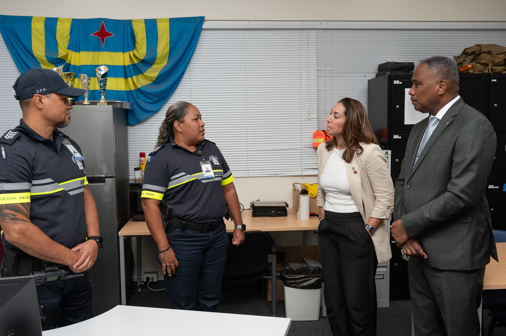 Diahuebs merdia, Minister di Husticia Arthur Dowers, hunto cu Inmigracion Aruba, a ricibi Minister di Husticia di Sint Maarten pa un presentacion strategico riba e sistema moderno cu na Aruba ta implementando na aeropuerto. E encuentro aki ta confirma e posicion di Aruba como lider regional den innovacion, siguridad y eficiencia den proceso di entrada y salida di pasaheronan.