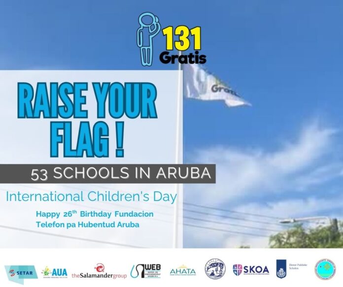 De cuadro di e celebracion di dia Internacional di Derecho di Mucha y 26 aña di existencia di 131 Aruba, un total di 53 scol ful rond di Aruba ta lanta e bandera di 131 aruba ariba dia 20 di november. Cu lantamento di e bandera di 131 Aruba, e scolnan ta mustra nan apoyo y gradicimento pa e trabao cu 131 Aruba ta implementa na e scolnan.