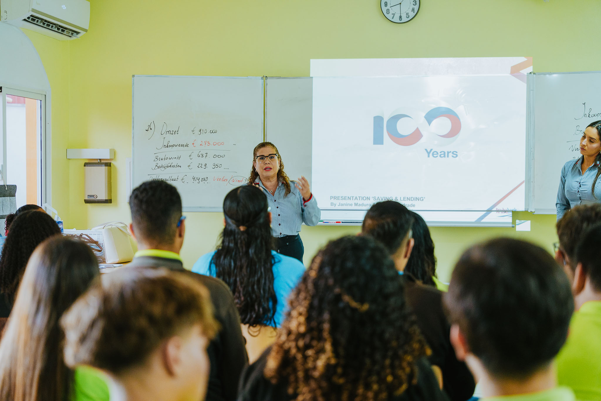 Representantenan di Aruba Bank a duna e studiantenan e oportunidad pa participa den discusionnan interactivo, comparti conseho practico tocante cuenta bancario, con pa spaar regularmente y traha un presupuesto. Studiantenan a ser motiva pa pensa constructivo riba nan escogencia financiero y con pa plania pa un futuro sigur.