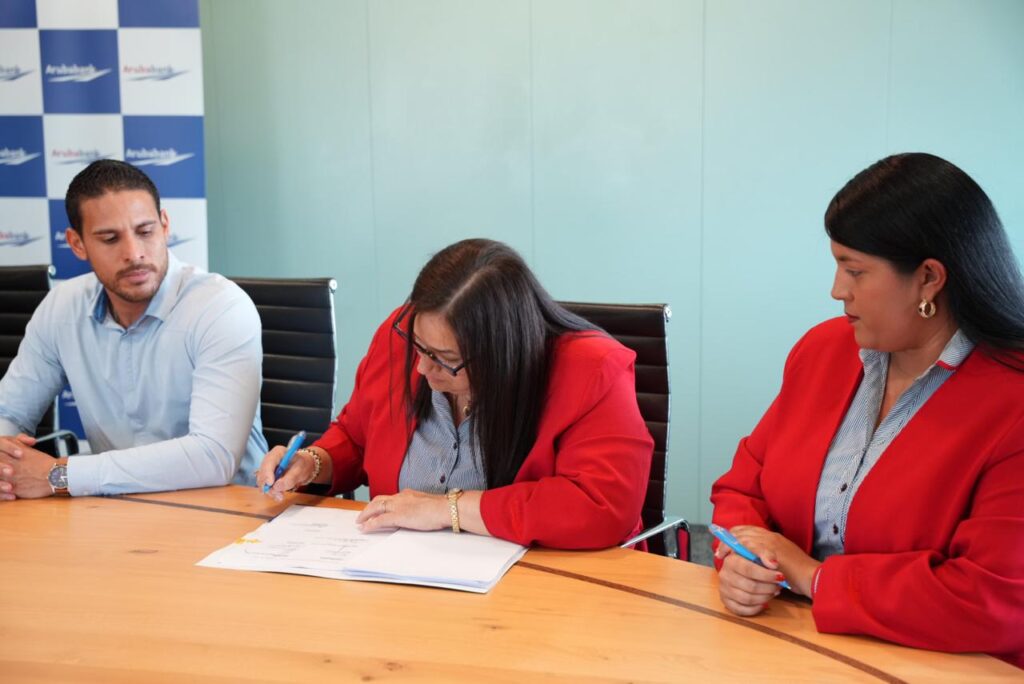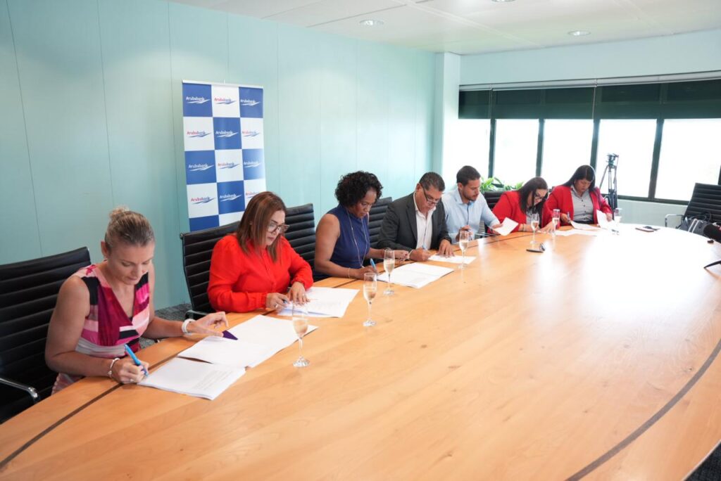 Aruba Bank ta aprecia e colaboracion cu FTA y ta sigui comprometi cu fomenta un ambiente di laboral sostenibel, husto, sostenibel y orienta riba futuro pa tur empleadonan. E acuerdo aki a wordo logra danki na esfuersonan colaborativo di Sr. Hose Figaroa, Sr. Aldrick Pontilius and Sr. Ryan Giel, representando FTA, y na nomber di Aruba Bank, Sra. Marleen van der Borgt, Sra. Nataly Simmons, Sra. Militza Oduber-Gietel, Sra. Gjalynn Kolfin, hunto cu e shop stewards Sra. Mirla Koolman y Sra. Ninette Croes.