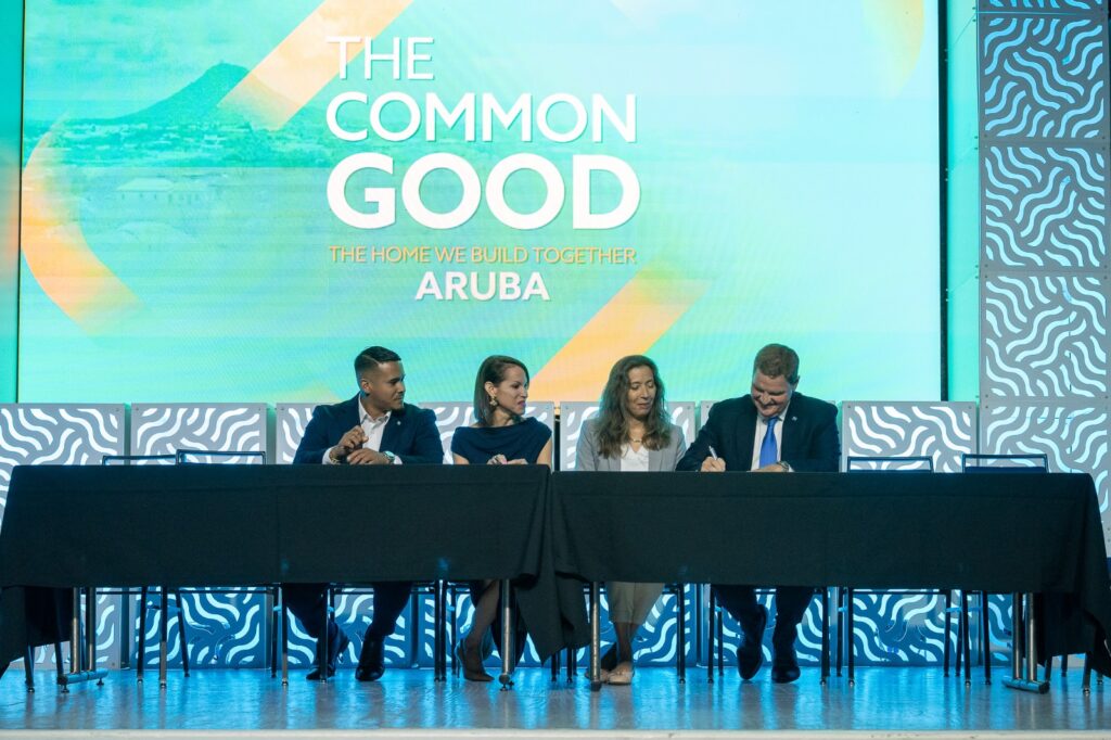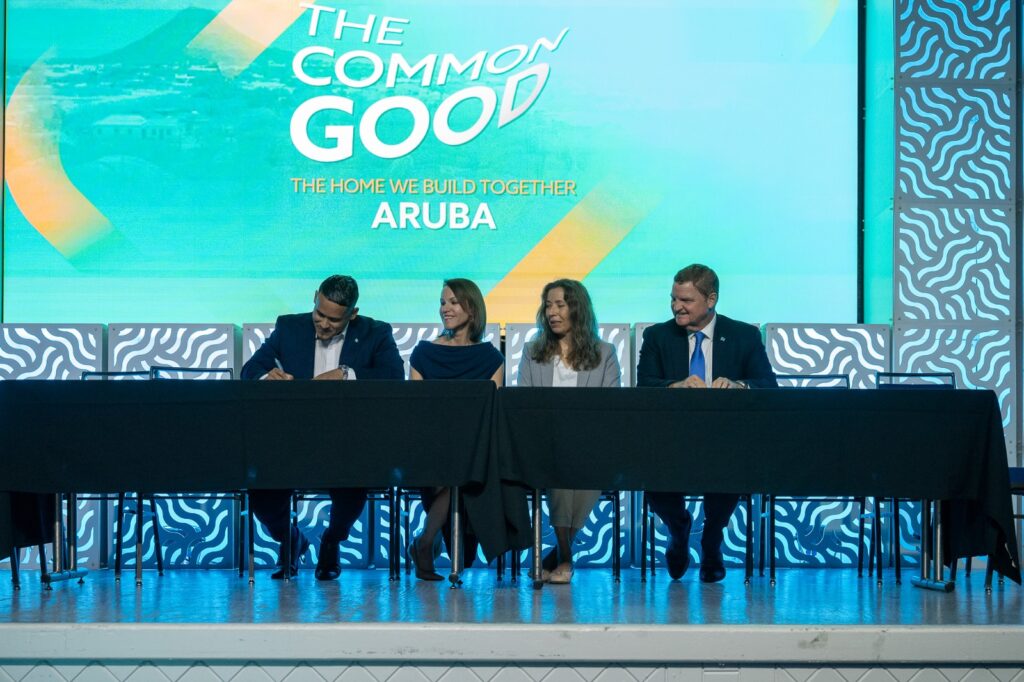 Durante e momento significativo di firmamento, como parti di e Common Good Conference, den presencia di Prome Mnister Mike Eman y Minister di Turismo Wendrick Cicilia, Natasha Silva di Aruba Conservation Foundation y Ronella Croes di Aruba Tourism Authority, a firma un Memorandum of Understanding (MoU) pa continua y fortifica e cooperacion den nos barionan.