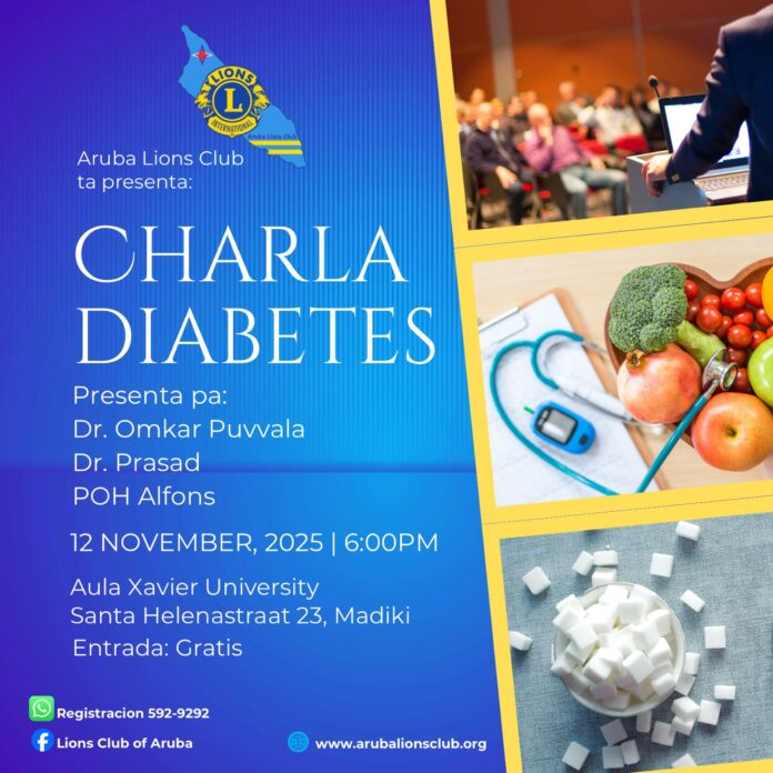 November 14, a ser declara Dia Mundial di Diabetes, y pa concientiza nos comunidad y como parti di e programa di Lions Club International nos ta presenta e actividad aki pa nos comunidad en general. Aruba Lions Club sirbiendo e Pueblo di Aruba pa 78 aña caba ta convenci cu mas informacion bo tin, mihor bo por cuida y preveni e malesa aki, y si ya bo tine lo bo haya informacion valioso pa sigi cuida y mehora bo calidad di bida apesar di reto nan cu por presenta.