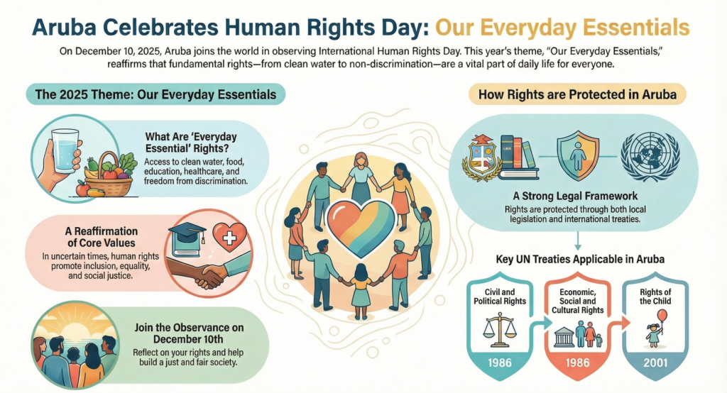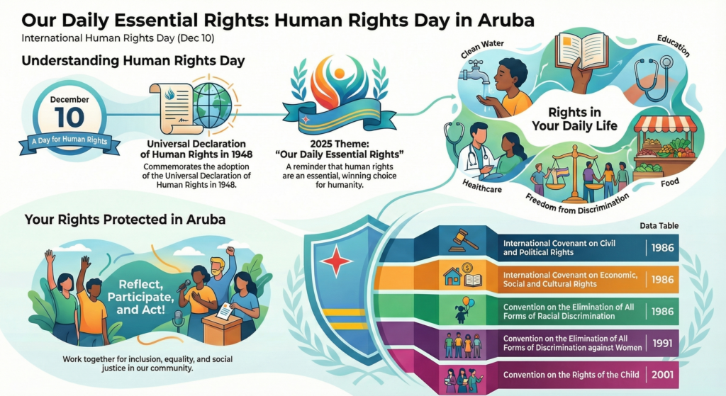 Riba dia 10 di december Aruba ta uni cu resto di mundo den celebracion di Dia Internacional  di Derechonan Humano, conmemorando e adopcion di e Declaracion Universal di Derechonan Humano di  Nacionnan Uni na 1948. Cada aña ta enfoca riba un tema specifico y e aña aki esaki ta “Nos Derechonan  Esencial Diario”, resaltando con derechonan humano ta un parti esencial di nos bida diario.
