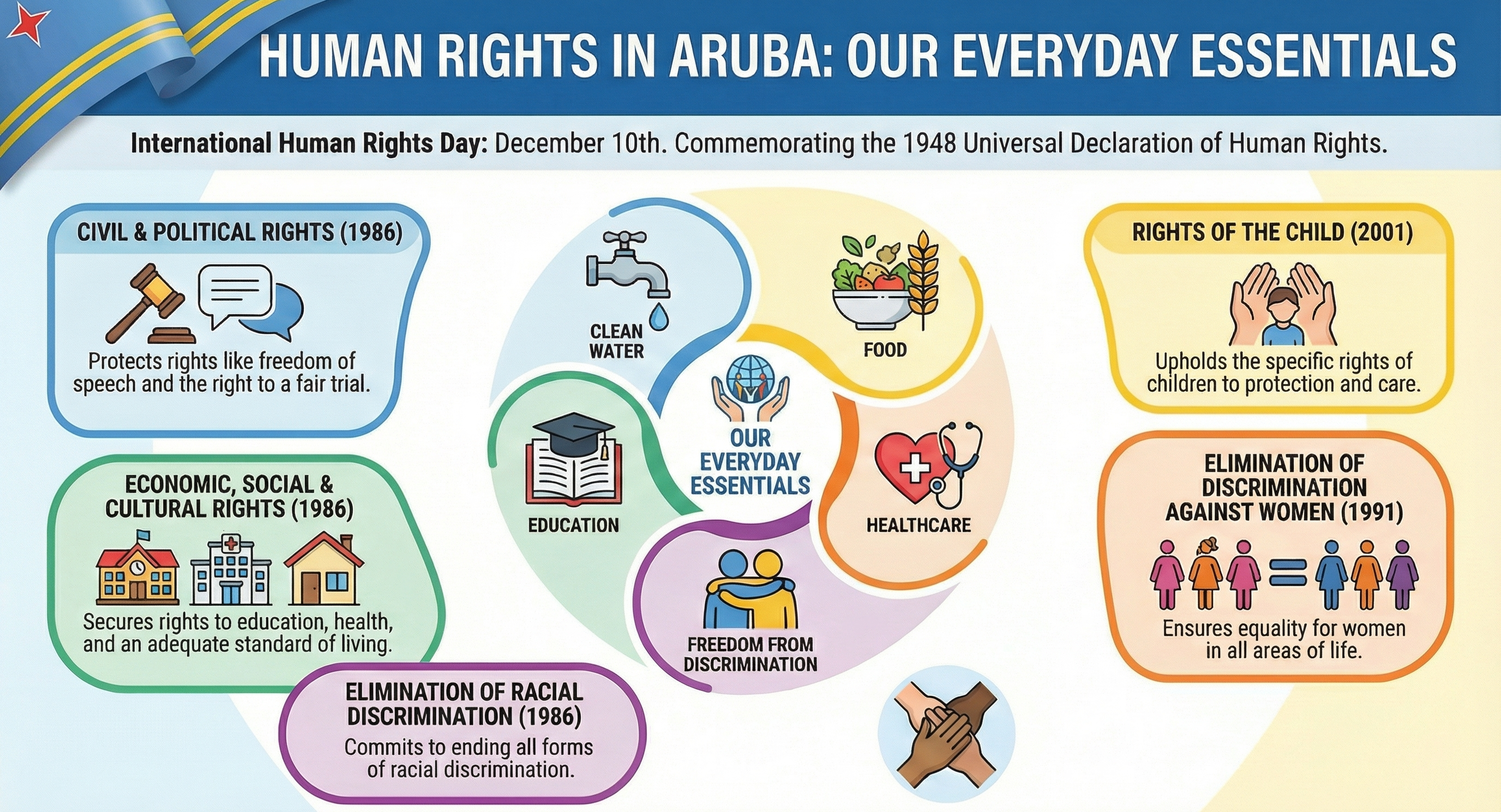 Riba dia 10 di december Aruba ta uni cu resto di mundo den celebracion di Dia Internacional  di Derechonan Humano, conmemorando e adopcion di e Declaracion Universal di Derechonan Humano di  Nacionnan Uni na 1948. Cada aña ta enfoca riba un tema specifico y e aña aki esaki ta “Nos Derechonan  Esencial Diario”, resaltando con derechonan humano ta un parti esencial di nos bida diario.