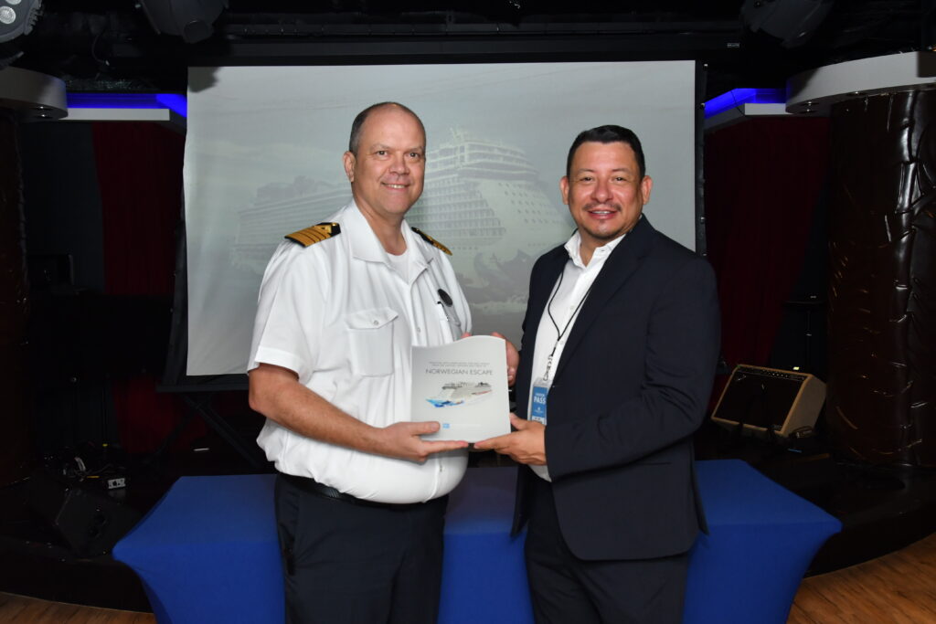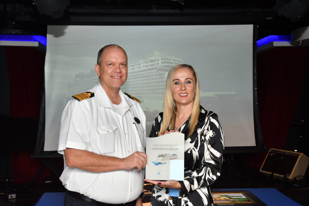 Presente tabata Monica Bos, Cruise Manager di Aruba Tourism Authority, Marc Figaroa, CEO di Aruba Ports Authority NV (APA) y Mario Arends, Commercial Manager di Aruba Ports Authority. Port agency S.E.L. Maduro & Sons, tambe a uni pa e ocasion. E delegacion a ricibi un bon bini caluroso abordo di Norwegian Escape, unda tabatin un ceremonia tradicional di intercambio di plakkaat. E intercambio aki ta un custumber maritimo estableci den cual e capitan di e barco y representantenan di e waf ta intercambia plakkaat conmemorativio pa simbolisa amistad, colaboracion, y celebracion di e prome bishita di e barco na e destinacion.