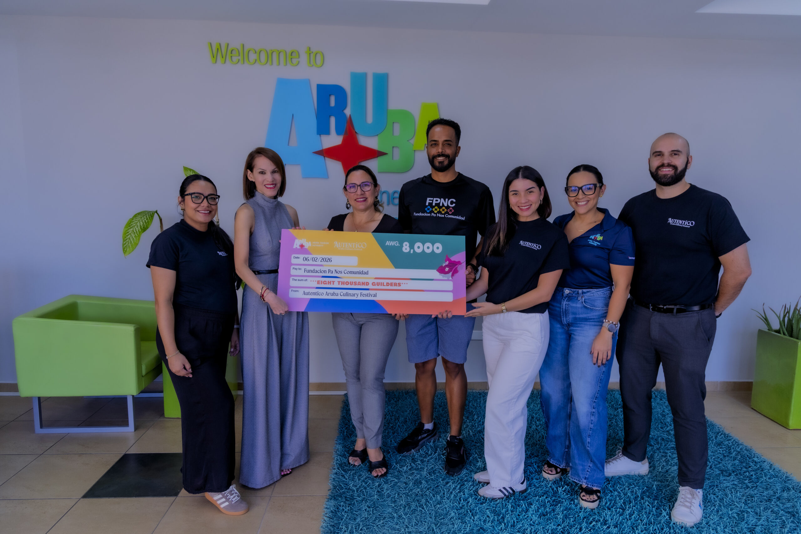 Aruba Tourism Authority (A.T.A.) orguyosamente a cumpli cu donacion di AWG 8,000 na Fundacion Pa Nos Comunidad (FPNC). Un contribucion cu a wordo genera durante e di dos edicion exitoso di e evento culinario, esta Autentico Aruba Culinary Festival 2025. Riba diabierna 6 di februari 2026, a entrega e donacion den presencia di CEO di A.T.A., Ronella Croes, hunto cu lider di e proyecto ‘Autentico’, Gilbert Wernet, Directrice di FPNC, Gianaika van der Biezen, representante di FPNC y demas representantenan di A.T.A.