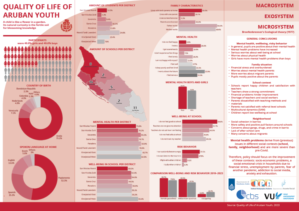 E Monitor pa Hubentud despues di COVID ta representa un set di data nacional unico cu ta cubri henter e populacion di hoben Arubiano entre edadnan 10 pa 12, pero tambe tur e alumnonan di eerste y tweede jaar di educacion secundario special a completa e cuestionario, cu permiso di nan mayornan. Tur directiva di scolnan a colabora, mas cu 100 profesionalnan riba e tereno di educacion a wordo entrevista, y discusionnan den grupo cu mayornan, a añadi contexto esencial. Hunto, e esfuerso aki a resulta den un di e setnan di data di bienestar pa Hubentud di mas comprensivo den e region. E informacion aki ta revela e retonan interconecta rond di salud mental, experiencia na scol, condicionnan den famia y e ambiente den bario. Hopi hoben a raporta di tin carganan emocional, sosten limita na scol, stress na cas y preocupacionnan tocante siguridad den nan comunidad.