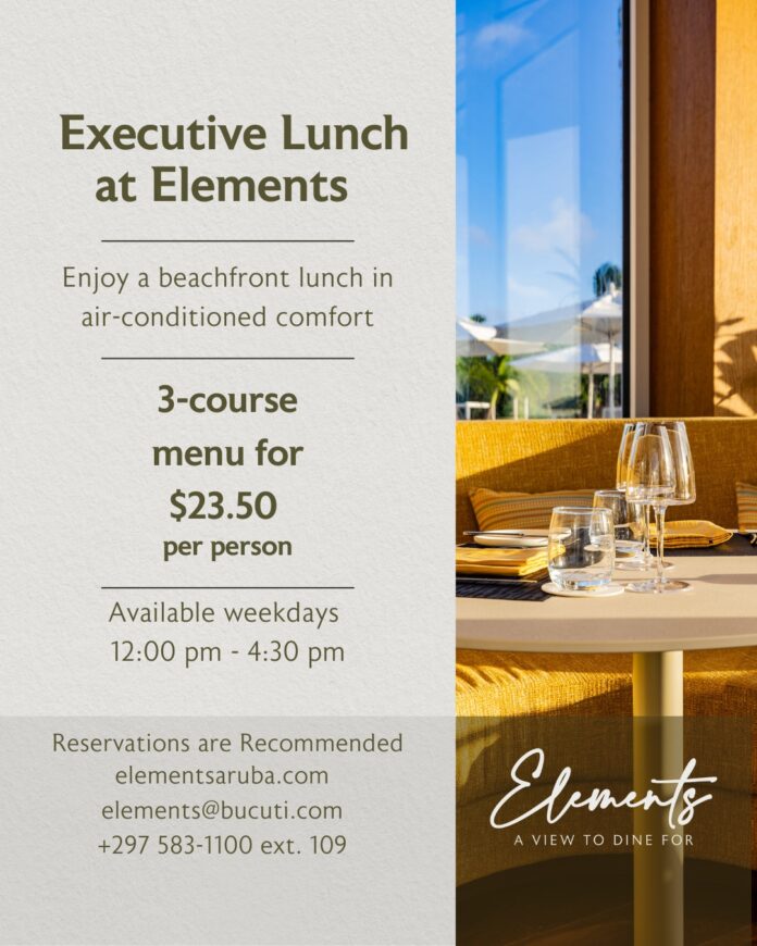 Tin un miho luga pa hasi negoshi na Aruba, y e ta situa riba Eagle Beach mes. Elements Restaurant, situa na e renombra, adults-only Bucuti & Tara Beach Resort, a introduci su Executive Lunch nobo, un experiencia culinario di tres plato diseña pa profesionalnan cu ta busca un ambiente comodo y priva pa un almuerzo di trabou eleva. Disponibel durante dianan di siman for di 12:00 te 4:30 p.m. y cu un prijs di $23.50 pa persona, e Executive Lunch ta inclui un escogencia di entrada, plato principal y postre, hunto cu un bebida no-alcoholico gratis.