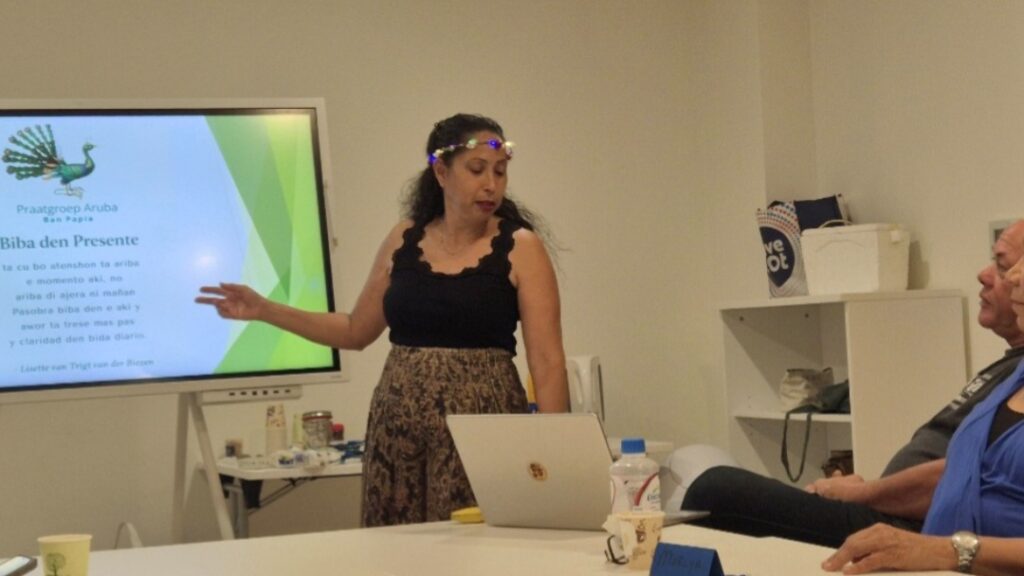 Recien mi tabata testigo di tres di e varios encuentronan cu señora Lissette van Trigt a tene na grup’i bishitante cu interes den su praatgroep presenta. E lugar tabata MFA Paradera, pero tambe ta uza MFA Noord y Savaneta. E temanan tabata eo. duna y ricibi compliment, me time y biba den presente.