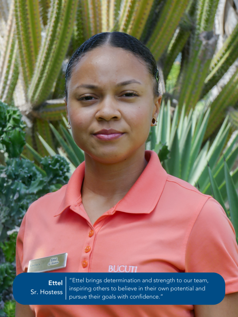 Tur anochi na Elements restaurant, Ettel Boyce ta para na e curason di e experiencia di bishitante. Cu precision y liderazgo calmo, e ta coordina reservacionnan, brinda apoyo na su ekipo y ta percura cu cada yegada di cada bishitante ta desaroya sin problema, sabiendo cu cada bishitante ta creando un recuerdo pa bida.