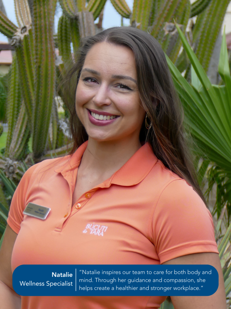 Ademas di brinda cuido adapta di bienestar pa bishitantenan di Bucuti & Tara, Natalie ta hunga un rol importante den apoyando bienestar di e Bucuti Associates. Pa hopi miembro di ekipo, e prome paso pa drenta gymnasium por sinti intimida, pero Natalie ta transforma e momento ey den uno di animo y posibilidad.