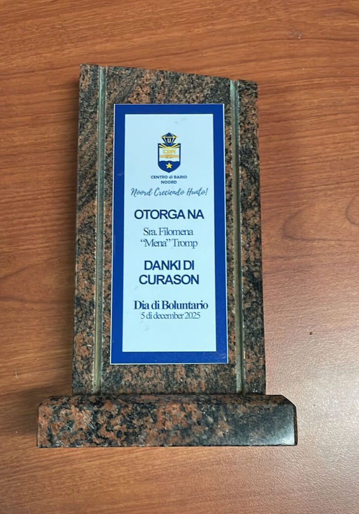Dia 5 di december, Aruba a celebra “Dia di Boluntario,” un dia dedica specialmente pa honra tur hende cu ta duna nan tempo, energia y talento pa sirbi nos comunidad. Den e cuadro aki, Directiva di Centro di Bario Noord (CBN) a tuma momento pa reconoce un figura realmente excepcional: Sra. Maria Filomena “Mena” Tromp-Eckmeyer, un boluntario ehemplar cu casi 50 aña di dedicacion continuo na nos dushi distrito di Noord.