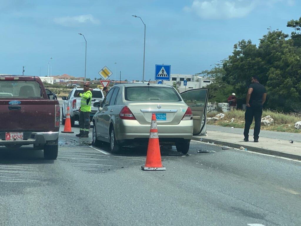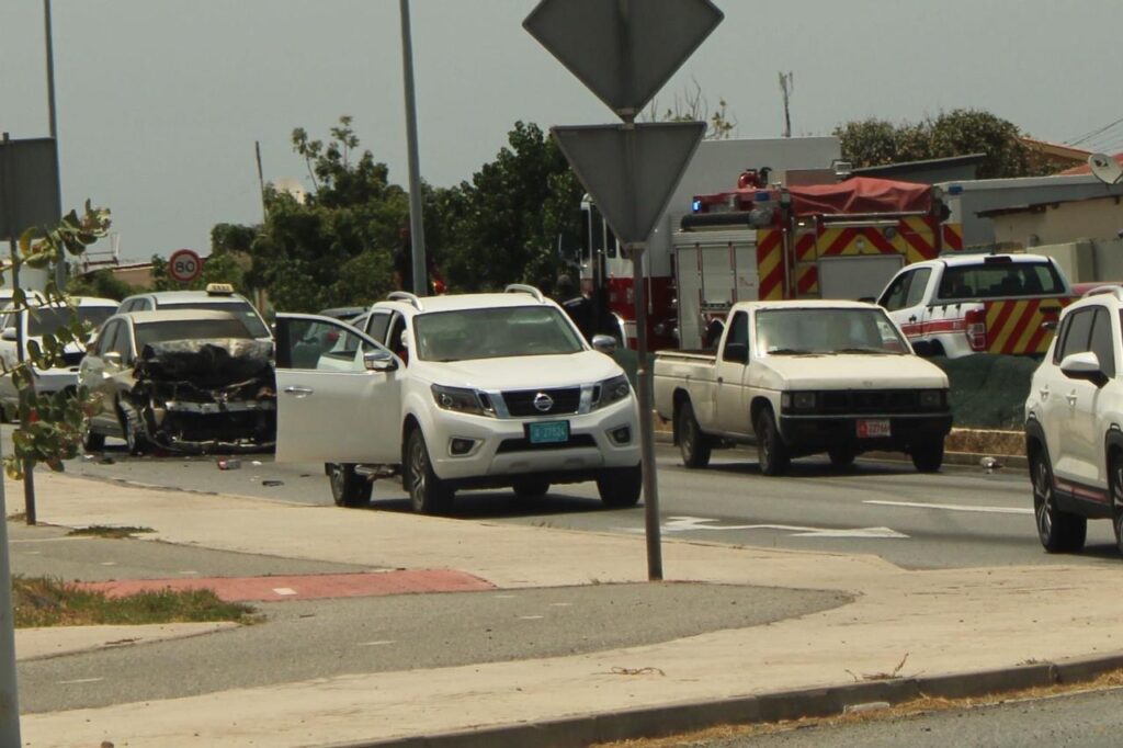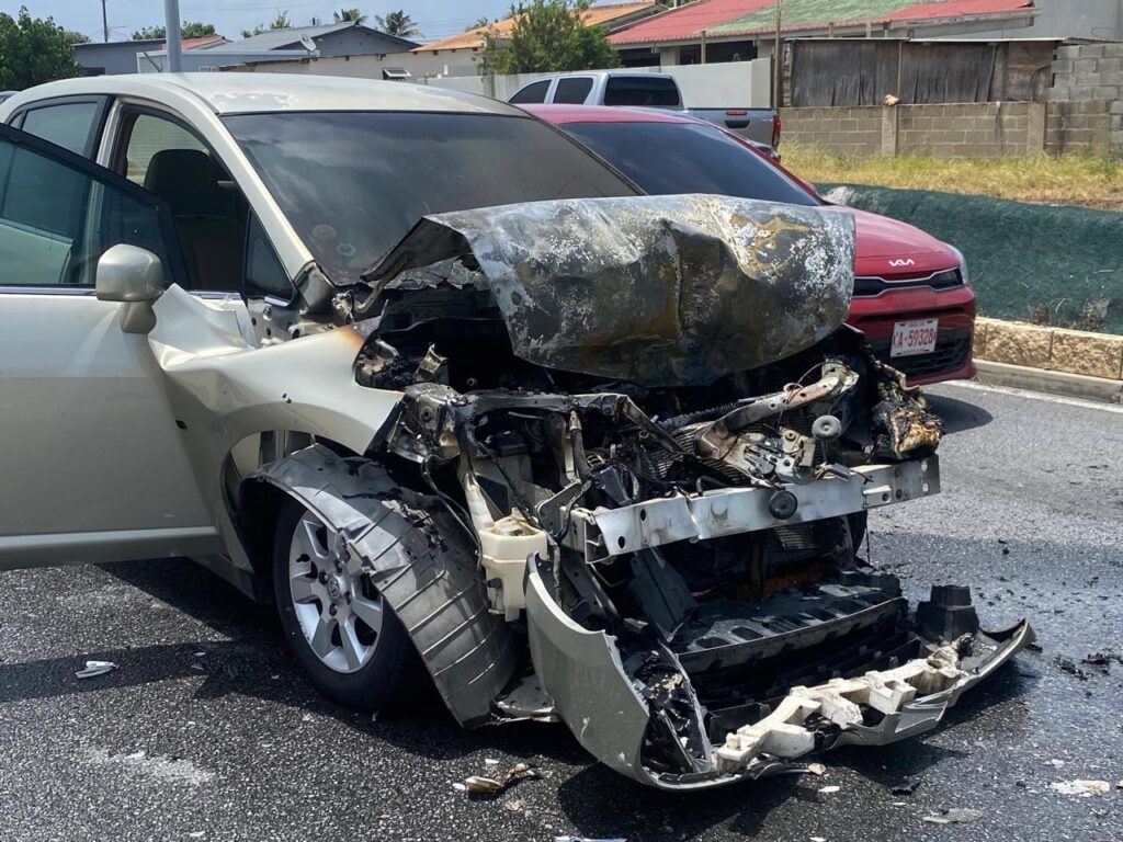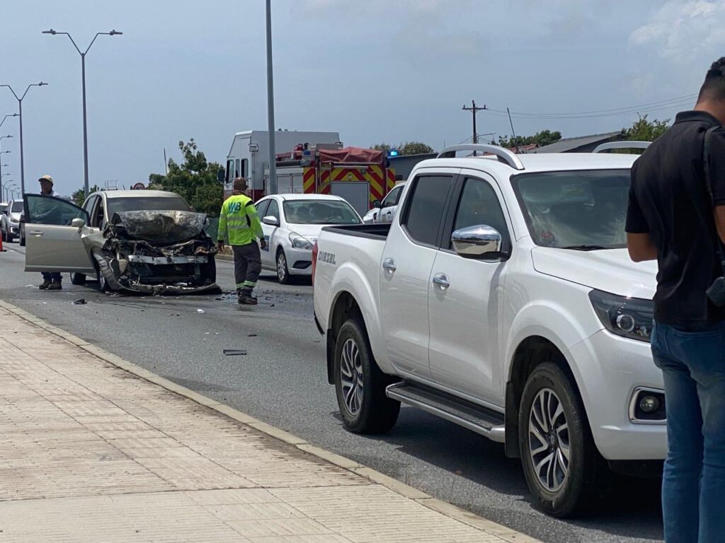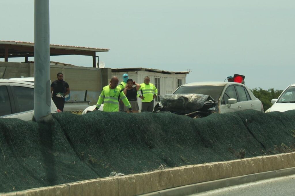 Diaranson mainta a drenta informe di cu un auto lo a pega na candela riba E.J. “Watty” Vos blvd., mesora a dirigi tanto polis como bombero na e sitio. Na yegada di bomberonan a bin constata cu aki ta trata di un Nissan Tiida bayendo pabao a bay dal fuertemente tras di un Nissan Frontier pick-up. Debi na e impacto e Nissan Tiida a pega na candela. Bomberonan mesora a combati, domina y paga e candela. Afortunadamente ningun hende a resulta herida.