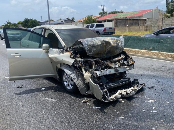 Diaranson mainta a drenta informe di cu un auto lo a pega na candela riba E.J. “Watty” Vos blvd., mesora a dirigi tanto polis como bombero na e sitio. Na yegada di bomberonan a bin constata cu aki ta trata di un Nissan Tiida bayendo pabao a bay dal fuertemente tras di un Nissan Frontier pick-up. Debi na e impacto e Nissan Tiida a pega na candela. Bomberonan mesora a combati, domina y paga e candela. Afortunadamente ningun hende a resulta herida.