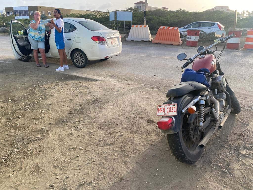 Diaranson atardi a drenta informe di un accidente cu hende levemente herida riba e caminda grandi pazuid di Palm Beach Plaza, mesora a dirigi tanto polis como ambulans na e sitio. Na yegada di e patruya ya caba ambulans tabata na e sitio y a atende e motociclista levemente heridA na e sitio mes. Locual a sosode ta cu ambos tabata bayendo zuid y e motociclista a bay pasa e auto y e auto a yega tuma un birada sin señal y sin spera a dal e motociclista bente abao y a herida su mes levemente na su pia.