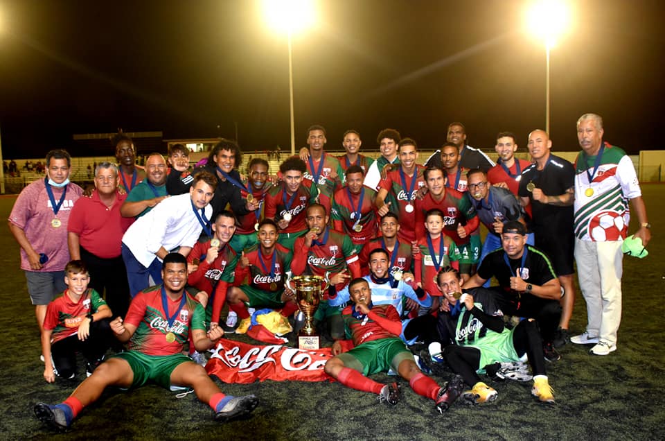 ORANJESTAD, Aruba – 25 di juli 2021: Tanto e marca di refresco mas bebi y gusta na mundo, Coca Cola, como tambe e ekipo di futbol Deportivo Nacional procedente di e districto di Noord, ambos a mantene nan puesto di ta campeon na Aruba. Ayera nochi Coca Cola Deportivo Nacional a titula campeon den futbol division di honor pa di seis biaha den nan historia!