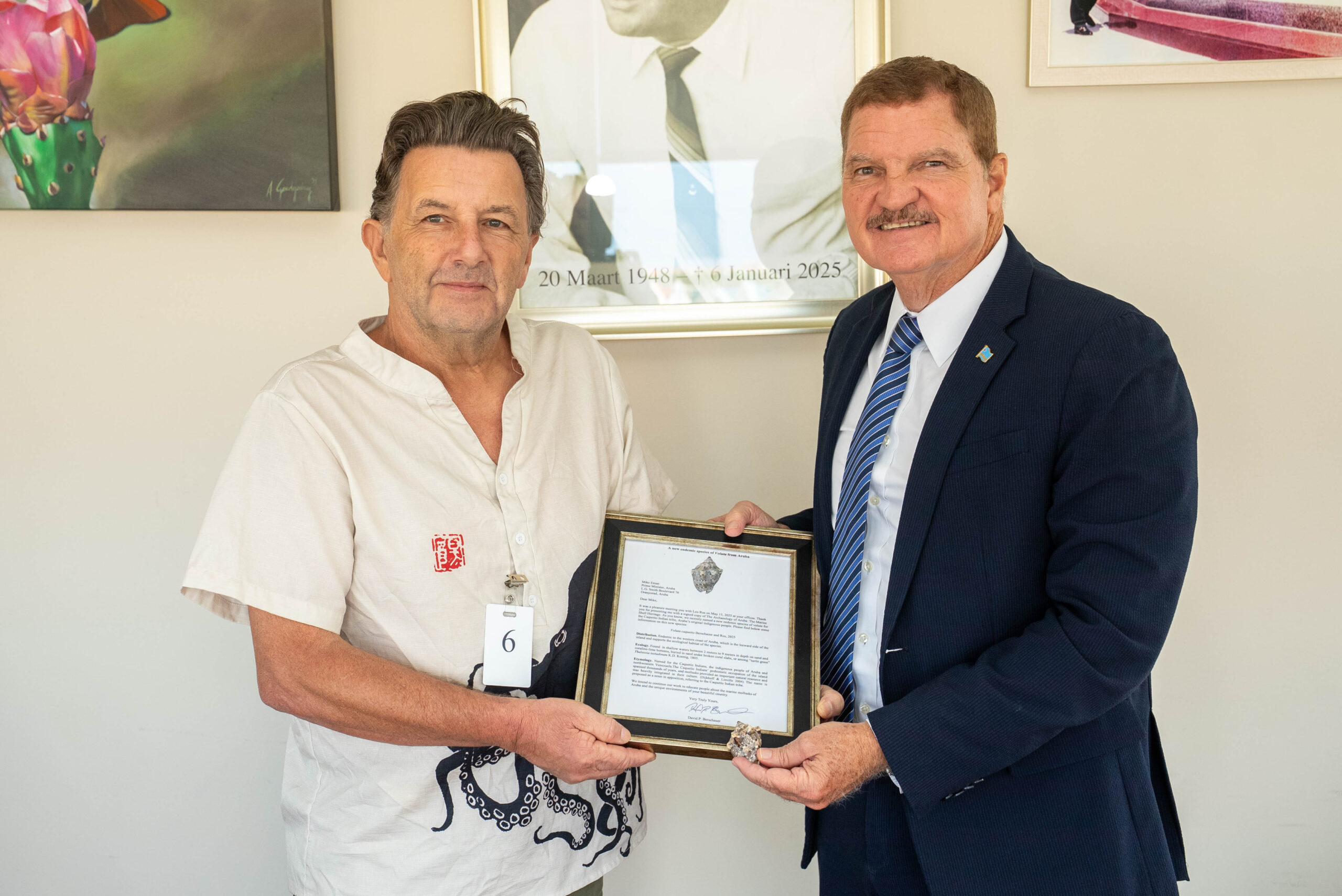 Durante bishita, Prome Minister Eman a ricibi un copia firma di e publicacion “The Archaeology of Aruba: The Marine Shell Heritage”, caminda ta mustra nan gradicimento sincero