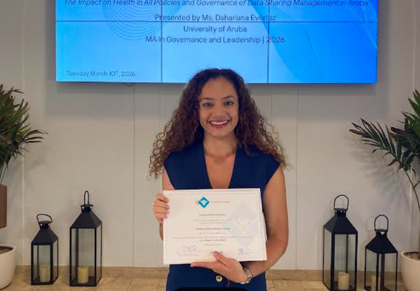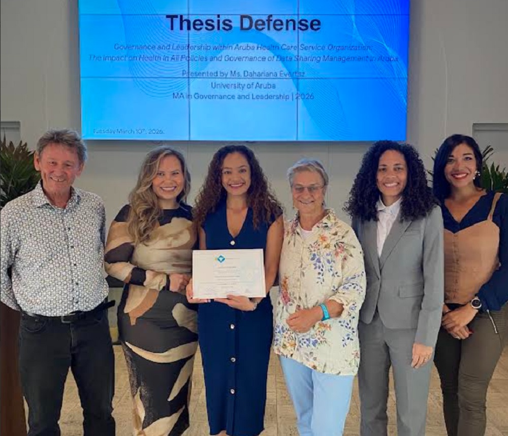 Dia 10 di maart 2026, Dahariana Evertsz a defende su tesis exitosamente y a obtene e titulo di ‘Master of Arts’ for di e programa Master Governance and Leadership (MGL) di e Facultad di Arte y Ciencia. Dahariana a defende su tesis ‘Governance and Leadership within Aruba Health Care Service Organization: The Impact on Health in All Policies and Governance of Data Sharing Management in Aruba’ dilanti di e comision di graduacion cu tawata consisti di Dr. Rosabelle Illes, Nadia Dresscher-Lambertus, MSc, y Judelca Briceño, MSc. Ademas tabata presente decano interino di Facultad di Arte y Ciencia Dr. Mieke de Droog, manager di e programa MGL, Thais Franken, MSc, famia di Dahariana, docente di Universidad di Aruba y coleganan di estudio y representante nan di sector di salud tambe tawata presente.