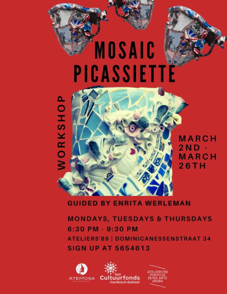 Cuminsando dialuna awor, 2 di maart 2026, Ateliers ’89 Punto di Beyas Arte Aruba ta invita bo pa un workshop interactivo di Mosaic uzando e tecnica special di Picassiette. E lesnan aki lo wordo duna pa e talentoso artista Enrita Werleman, kende tin hopi aña di experiencia y specialisacion den e arte aki.