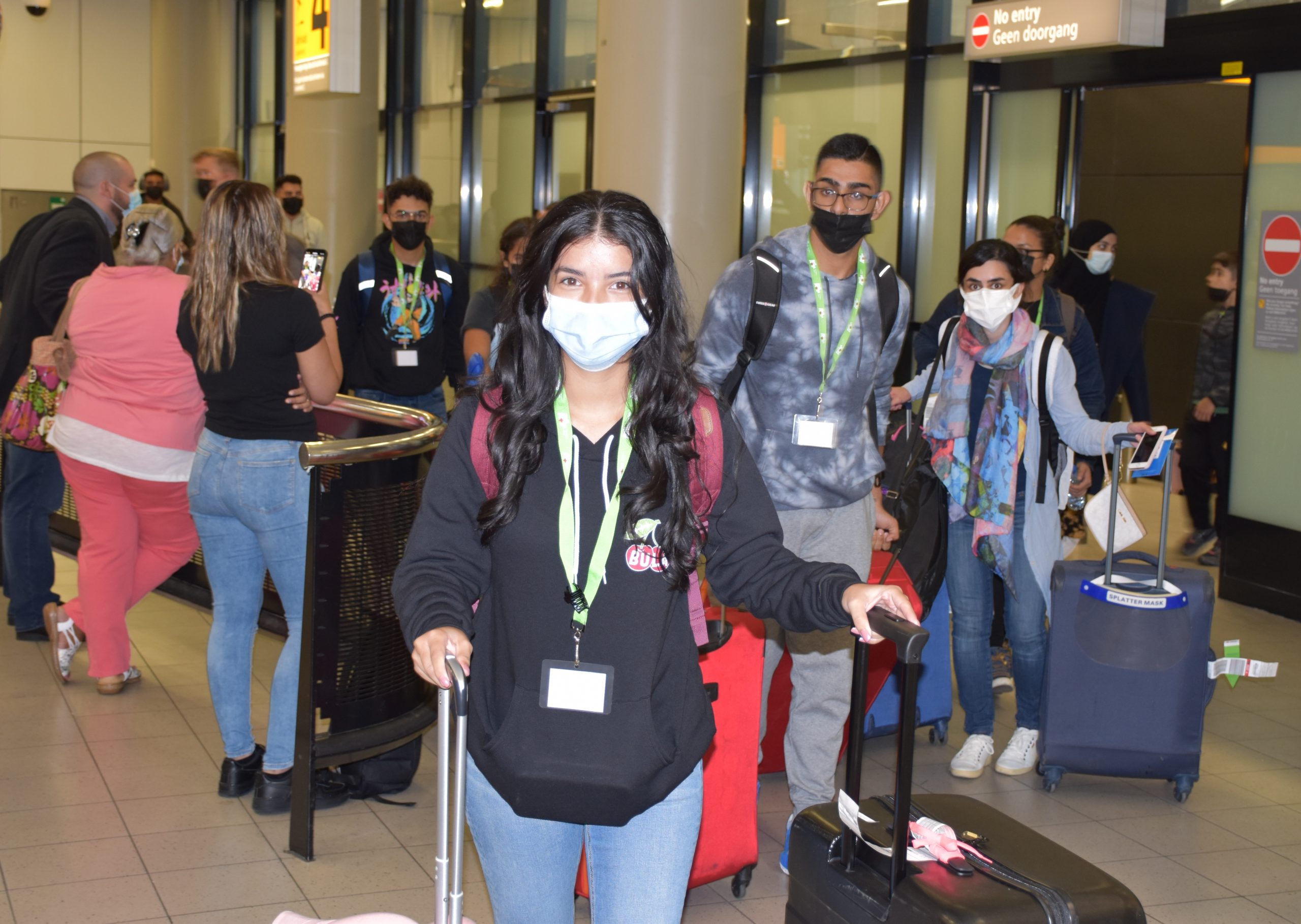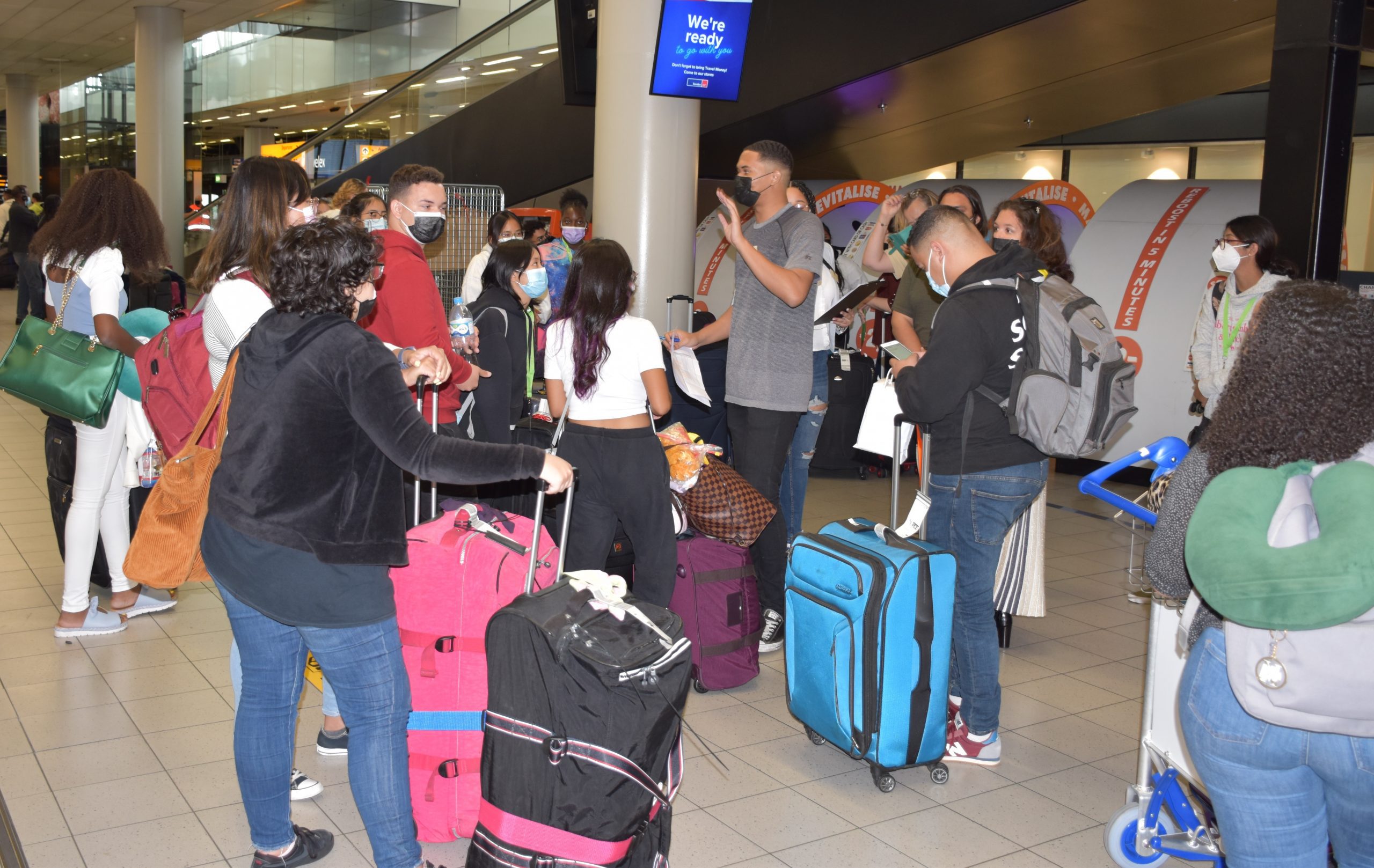 Pafor di e sala di yegada e studiantenan na un forma bon coordina y organisa a haya instruccion di personal di Cas di Aruba, mentornan y miembronan di e POC unda nan mester a para den grupo pa warda nan turno pa bai na e bus cu lo hiba nan na nan ciudad di estudio. Banda di Robby Schouten cu a haci grabacion na Schiphol, tambe Roy Kelly di e website Arubiano.nl a saca potret di e studiantenan.