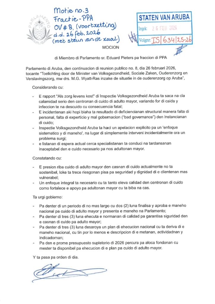Parlamentario Eduard Pieters di fraccion PPA a presenta un mocion fuerte durante reunion publico di diahuebs tocante situacion di cuido di adulto mayor na Aruba. E mocion tabata presenta cu argumento solido y a haya aprobacion tambe di henter cuerpo di Parlamento.
