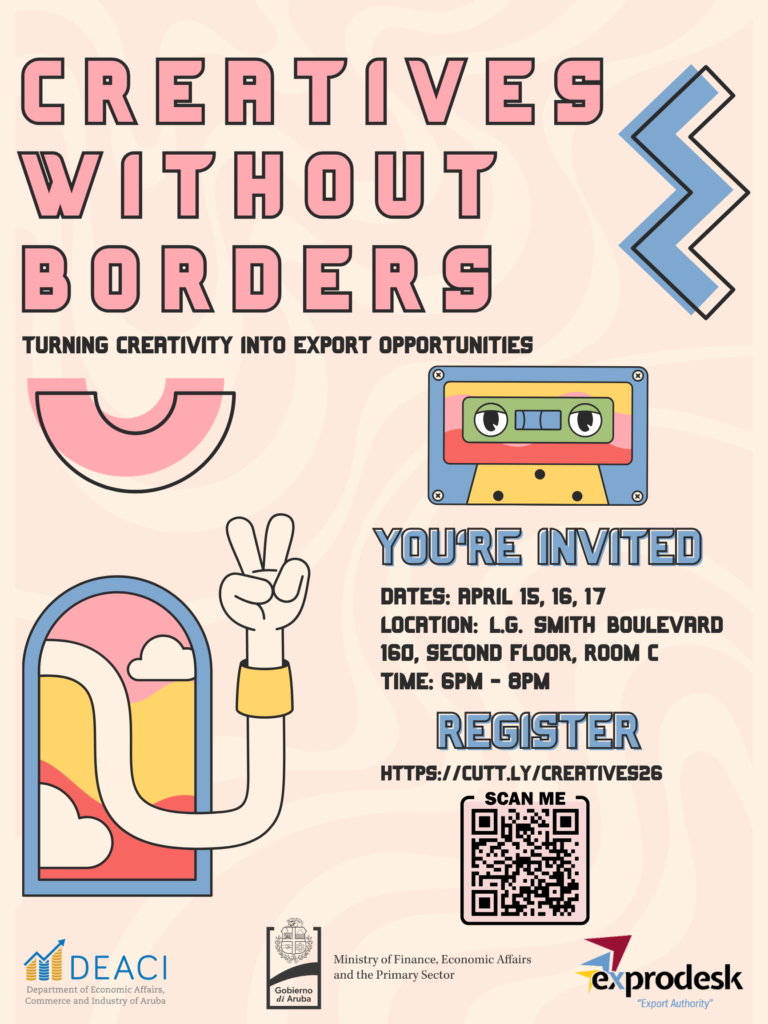 Departamento di Asunto Economico, Comercio y Industria (DEACI), pa medio di su unidad Exprodesk, ta anuncia e workshop di 3 dia “Creatives Without Borders: Turning Creativity into Export Opportunities.” E workshop aki ta enfoca riba yuda creativonan local explora con nan talento por bira un oportunidad internacional y crea ingreso for di mercadonan pafo di Aruba. Participacion ta completamente gratis!