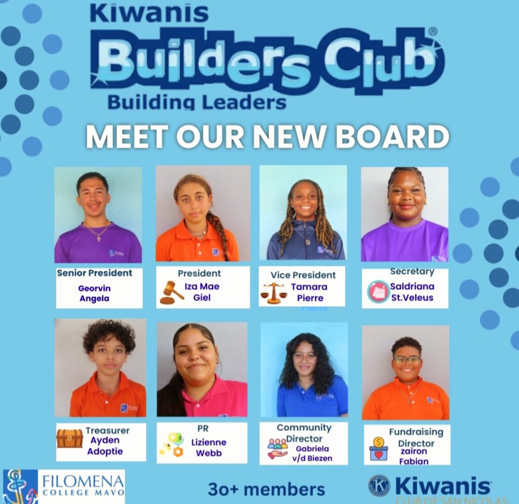 Tambe e dia aki, a presenta na tur presente e directiva nobo di e famoso club cu ta haci obra y eventonan importante pa comunidad di San Nicolas esta Kiwanis Builders Club of Filomena. E club ta bou guia di juffrouw Raquel Leocadia. A desea tur miembro hopi exito cu tur plan cu nan tin pa cu obranan nobo caricativo.