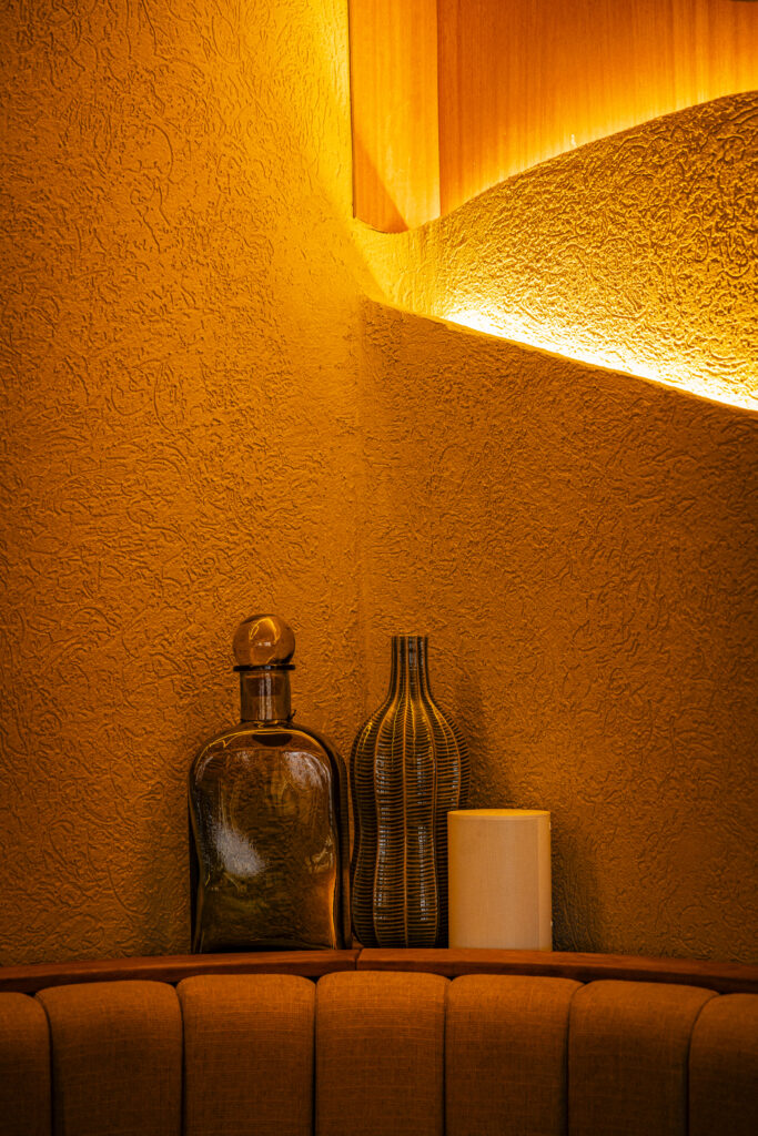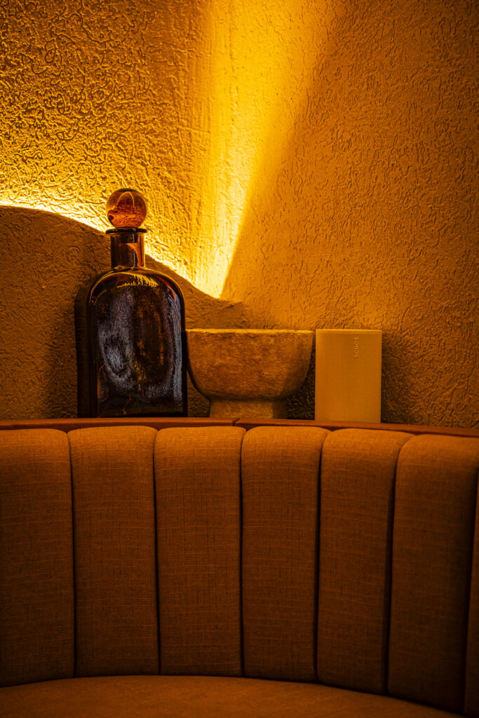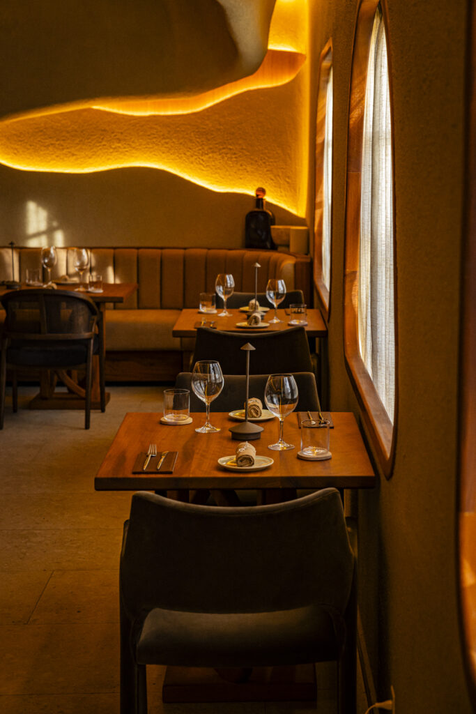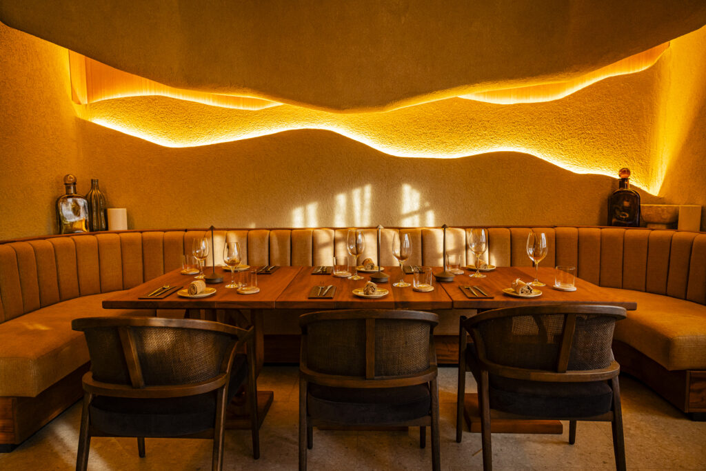 E sala di cena intimo ta ilumina pa e luz suave y natural di Aruba su “golden hour”, mientras cu e interior di diseño artesanal y material natural ta contribui na un sensacion di exclusividad y conexion personal.
