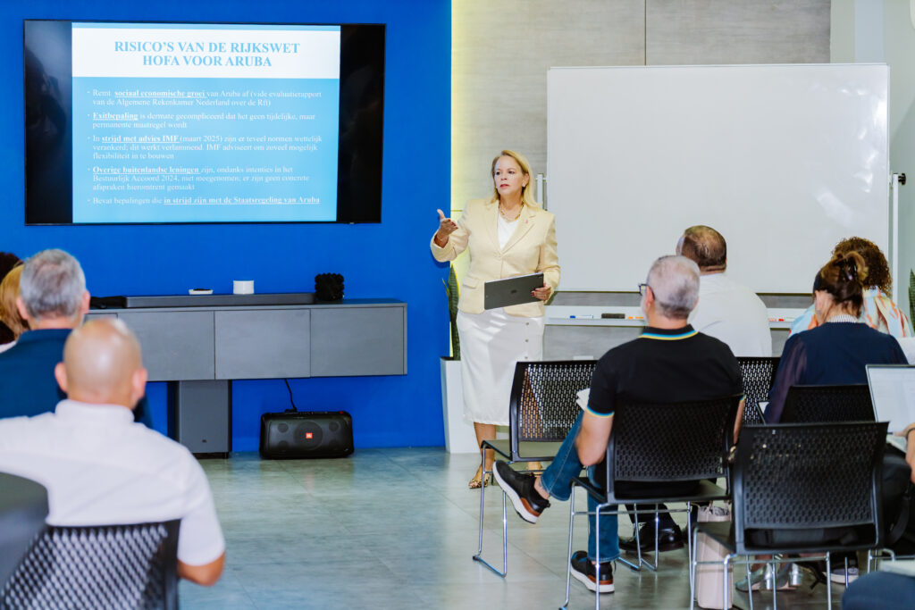 Lider di fraccion di MEP, sra. Evelyn Wever-Croes, a manda un mensahe fuerte y cla riba e mainta aki: “E ley di HOFA no ta bon pa Aruba, pasobra e ta frena nos desaroyo economico. E ley tin articulonan cu ta contra nos Constitucion. Ademas, Aruba ya tin un sistema di supervision financiero cu ta funciona bon. HOFA no ta soluciona nada, e ta solamente crea problema.” Durante e encuentro, MEP a presenta e opinion di profesor experto Elzinga, cu a confirma cu HOFA ta viola Constitucion y ta mina e base di colaboracion igual entre Hulanda y paisnan caribense. Wever-Croes ta splica con y dicon esaki ta un movida peligroso y con esaki lo limita nos desaroyo economico y pone nos pais bou di un control innecesario.