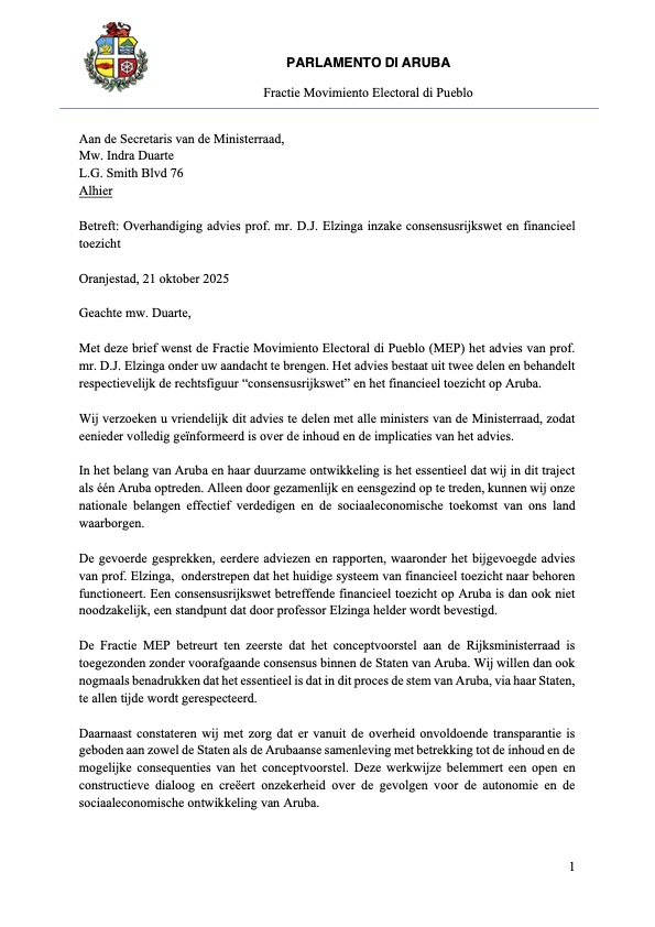 Diamars 21 di october, Fraccion di Movimiento Electoral di Pueblo (MEP) a entrega na e Secretaria di Conseho di Minister, e conseho di prof. mr. D.J. Elzinga riba e ley di consenso di Reino HOFA. E conseho, dividi den dos parti, ta trata e figura di ley di consenso di Reino (consensusrijkswet) y e supervision financiero di Aruba.