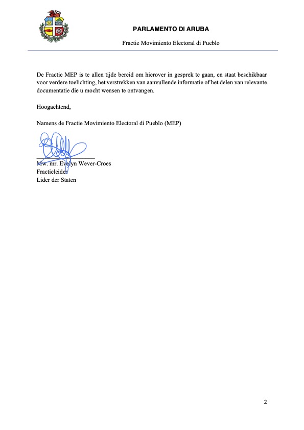 MEP ta expresa tambe su preocupacion pa falta di transparencia di parti di gobierno pa cu e Parlamento y e pueblo Arubano por ta informa tocante e contenido y e posible consecuencia di e propuesta.