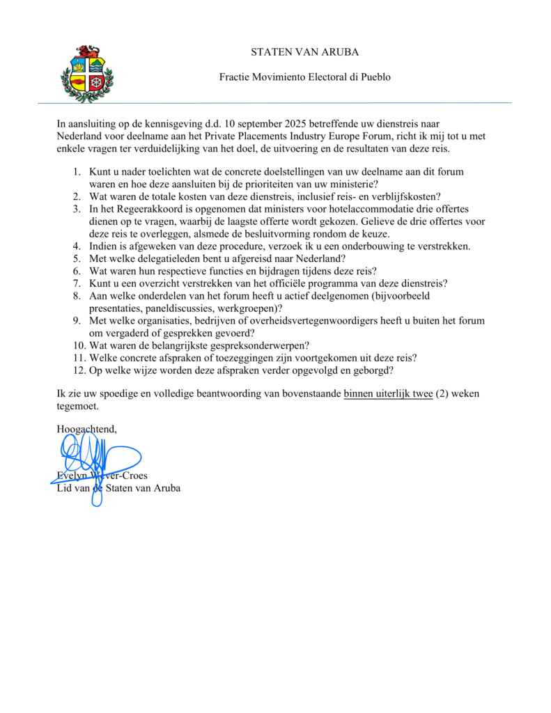 Fraccion di MEP den Parlamento a manda preguntanan oficial relaciona cu e biahe di trabou di Minister di Finansas, Geoffrey Wever, cu a tuma lugar na Hulanda entre 15 y 21 di september 2025.
