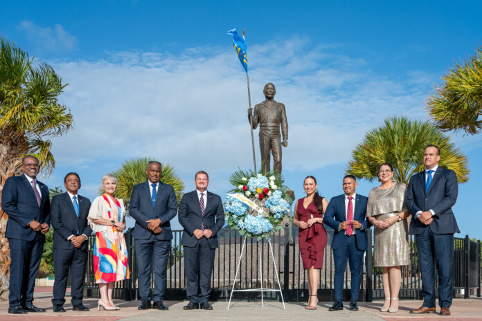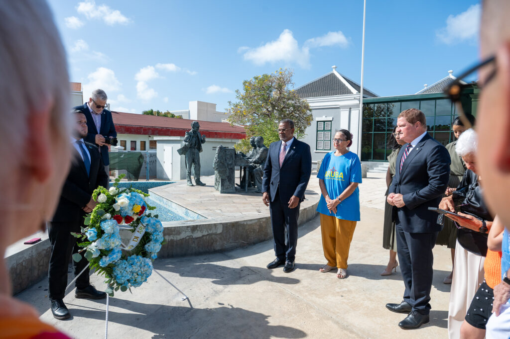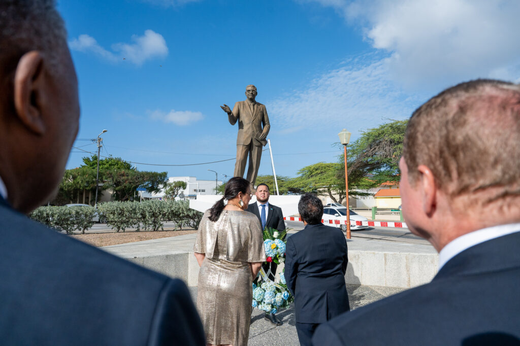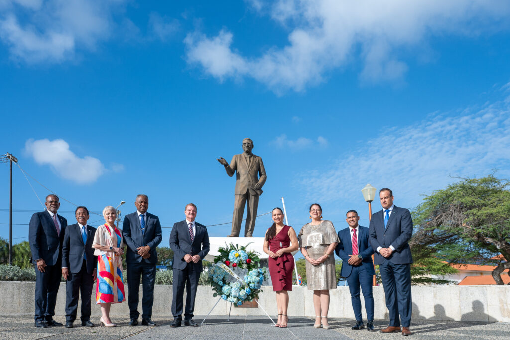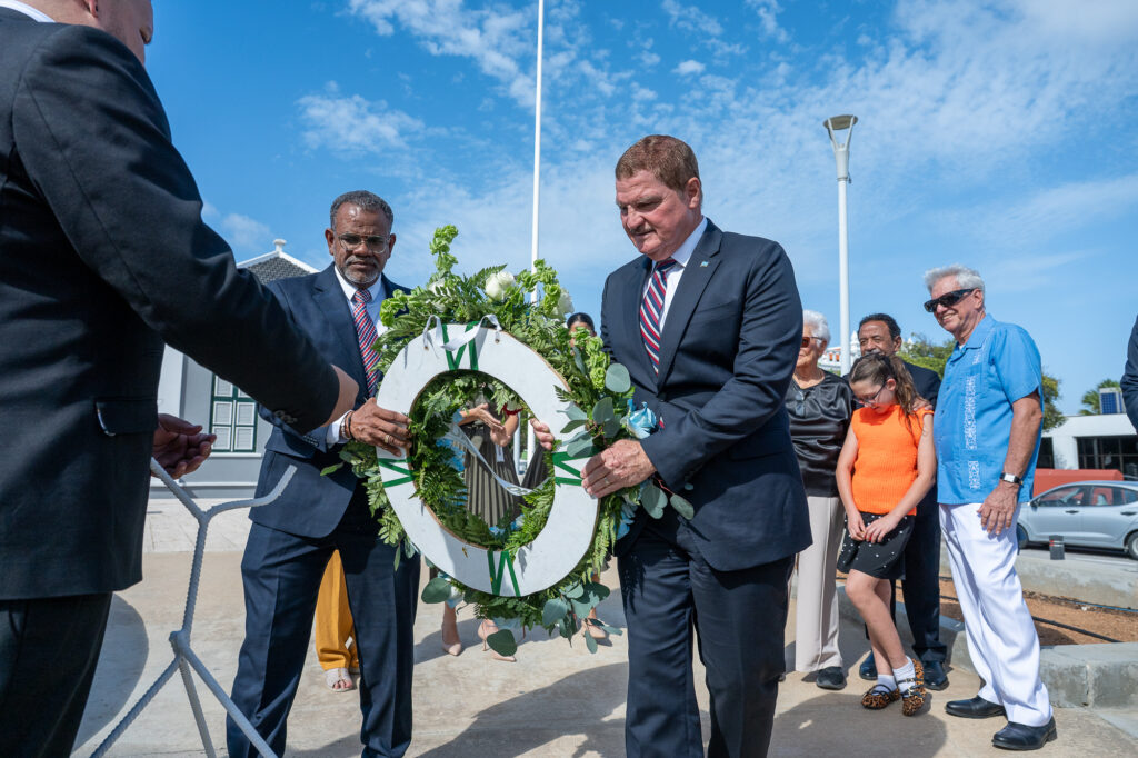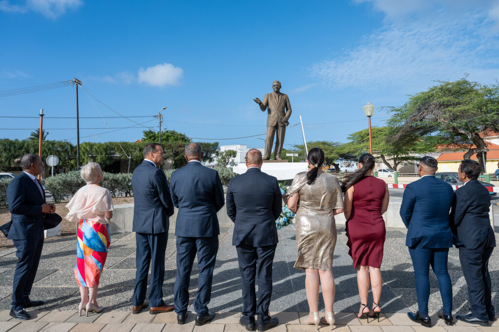 Den un ambiente di profundo respet y reflexion nacional, henter Gabinete AVP-Futuro, encabesa pa Prome Minister Mike Eman, acompaña pa Vice-Prome Minister Gerlien Croes, Minister Mervin Wyatt-Ras, Minister Geoffrey Wever, Minister Rene Herdé, Minister Wendrick Cicilia, Minister Arthur Dowers, Secretaria di Conseho di Minister Indra Hassel-Duarte y Presidente di Parlamento Marlon Sneek, a participa awe den un serie di acto solemne di ofrenda floral na diferente plaza historico rond di Aruba.