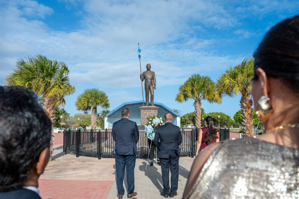 E ofrenda floral di awe a sirbi como un recordatorio poderoso: cu e libertad, identidad y progreso di Aruba ta basa riba e sacrificio di generacionnan cu a bin prome y cu e responsabilidad di sigui cu e legado aki ta den man di tur Arubiano.