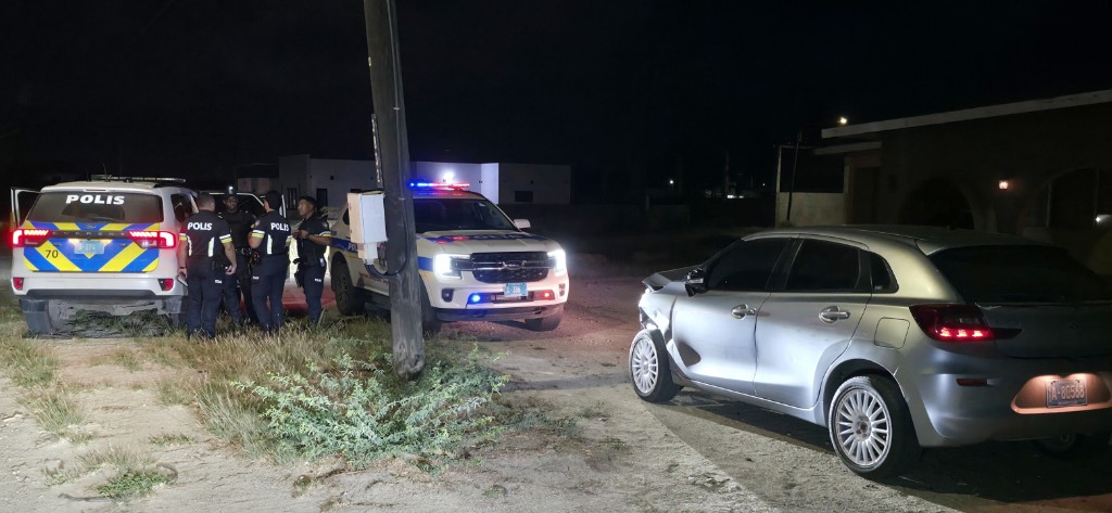 Pariba di e rotonde di Tanki Leendert a topa cu un rastra di azeta di auto y drenta e caya panort por a mira cu e auto lo a dal contra un palo di luz. Parti di e auto tawata benta eynan.