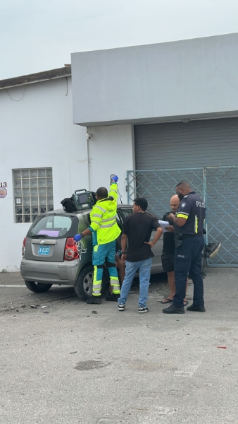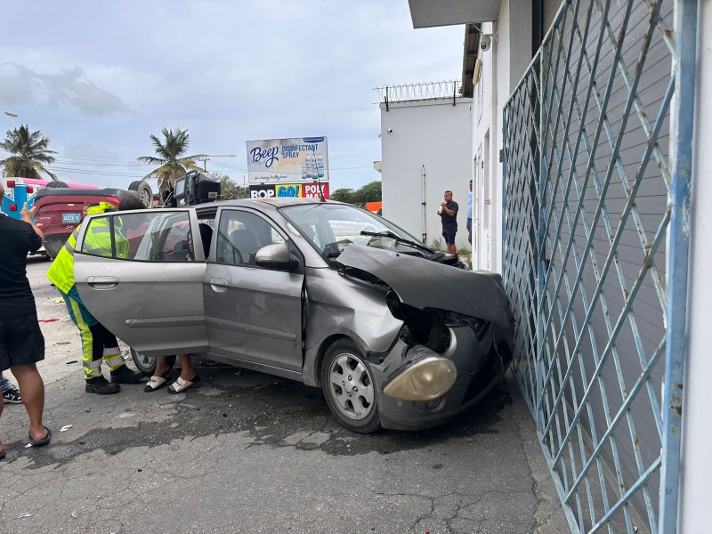 Polis a yega y ta haya un Hyundai Tucson riba su dak y un Kia Picanto pega contra entrada di un deposito.