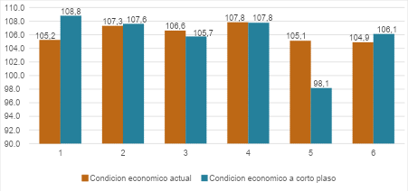 E indice di condicion economico a corto plaso a subi cu 8,0 punto di indice te na 106,1, mientras cu e indice di condicion economico actual a baha cu 0,2 punto di indice te na 104,9 den e segundo trimester di 2025 (mira Grafico 2).