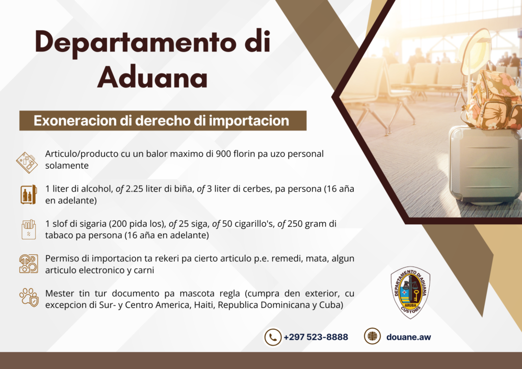 Pa mas informacion incluyendo importacion di articulonan special manera carni, remedi, mata, articulonan electronico of mascota, por bishita nos website www.douane.aw, tuma contacto cu nos via info@douane.aw of yama nos na +297 523 8888.