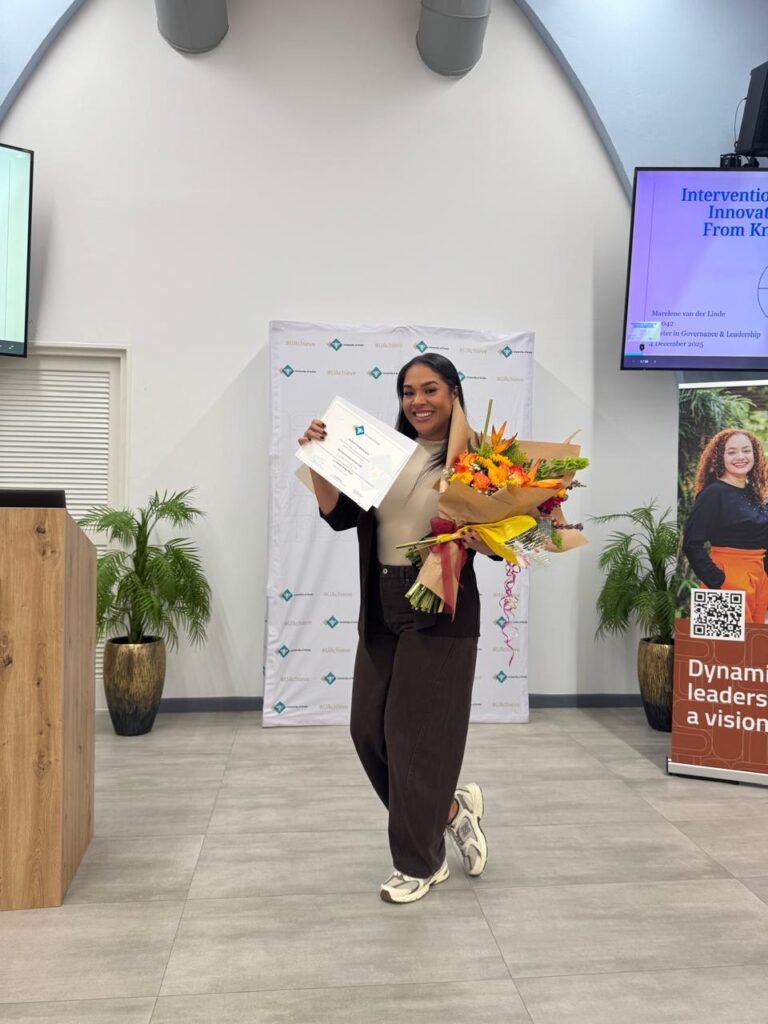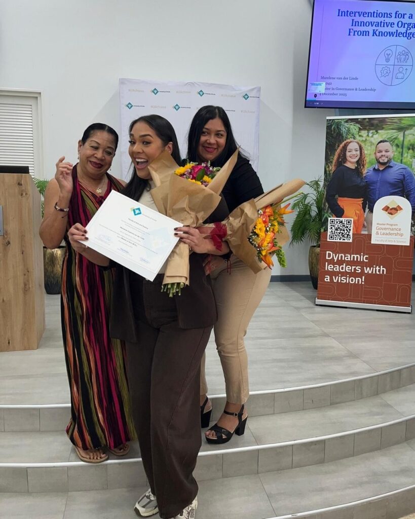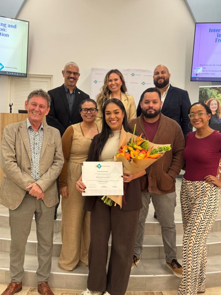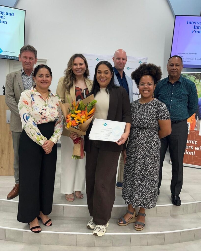 Marelene van der Linde a defende su tesis exitosamente y a obtene e titulo di ‘Master of Arts’ for di e programa Master den Governance and Leadership Facultad di Arte y Ciencia. Marelene a defende su tesis “Interventions for a Learning and Innovative Organization: From Knowledge to Action” dilanti di e comision di graduacion cu tawata consisti di Dr. Luc Alofs first supervisor, Drs. John Khodabux second supervisor, Dr. Arnout Prince. Ademas tabata presente manager di e programa MGL, Thais Franken, MSc, famia di Marelene, docente di Universidad di Aruba y colega di estudio tambe tawata presente.