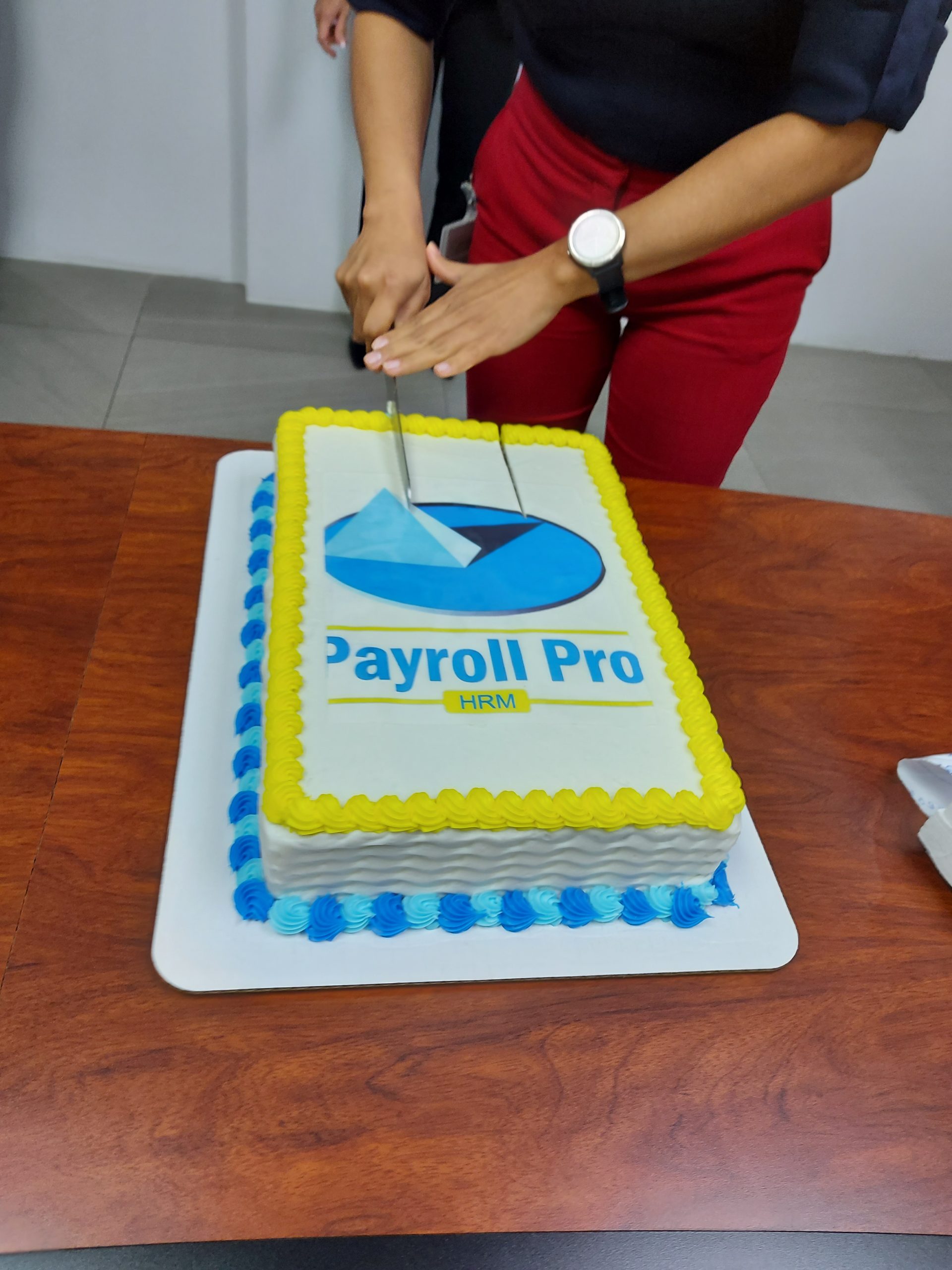 E team di Payroll Pro HRM a reuni cu Mr. Guus Slabbekoorn, Sra. Esmeralda Hernandez, Sra. Mirella Yarzagaray, Sra. Fanneska Dubero, Sra. Nikita Dirks, Mr. Gerald Thiel, Sra. Emeliën Kelly y Sra. Xiahaira Wernet y a obsekia nan cu un dushi bolo y un plakaat di gradicimento.