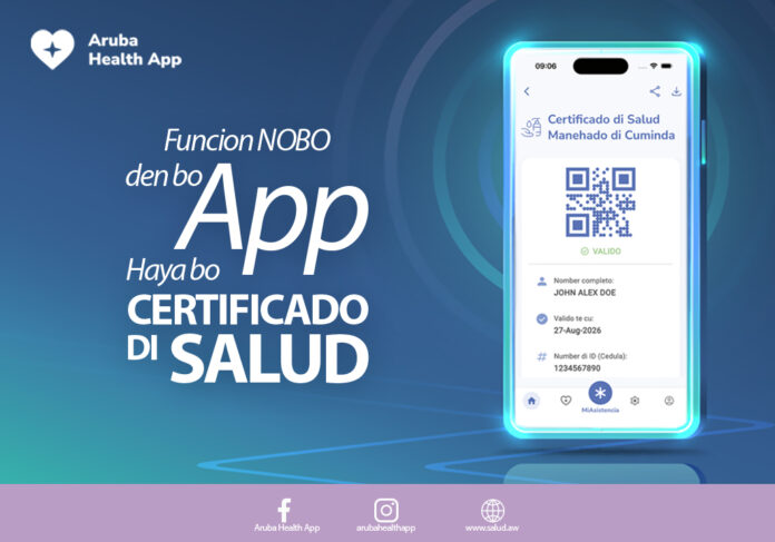 Departamento di Salud Publico ta orguyoso di por informa cu dentro di poco su servicio di Certificado di Salud (ex carchi berde) lo ta accesibel pa su clientela den e aplicacion di Aruba Health App.