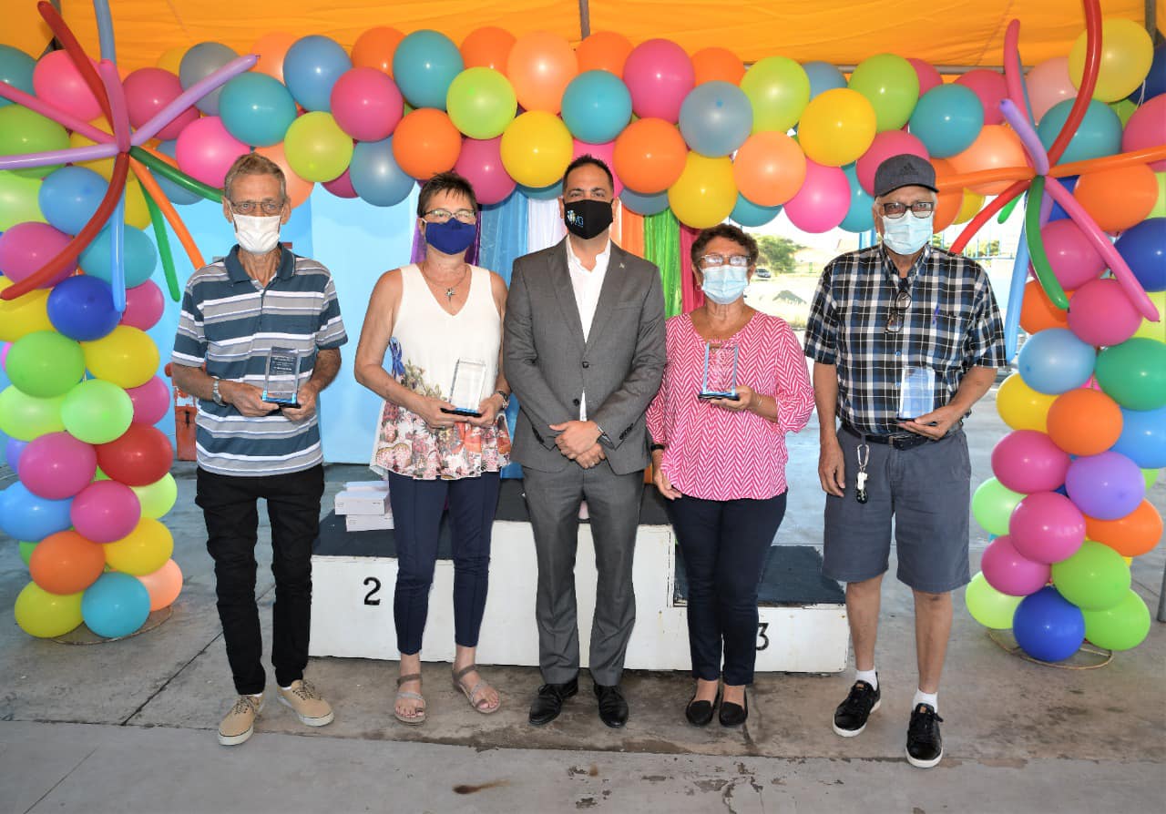 SAVANETA – Diabierna mainta na Piscina Olimpico, Roly Bisslik na Savaneta, Su Excelencia Minister di Deporte, Sr. Dangui Oduber a tuma e momento pa pone cuater baluarte “in het zonnetje”. E cuater personanan aki ta Bram Koole, Geoffrey Ho A Sjoe, Winnie Bisslik y Maicha Croes. Hunto nan tin hopi aña ta contribui na e formacion di nos muchanan di landamento. Pa hopi aña Bram, Geoffrey, Winnie y Maicha ta yuda cu e examen di zwemles pa nos muchanan di klas 3 di Scolnan Basico na Aruba. Cu nan conocimento, experiencia y contribucion esaki sin duda ta un ayudo enorme pa e organisacion di landamento escolar y e bin refleho cu e lo tini den tur sentido riba nos muchanan.