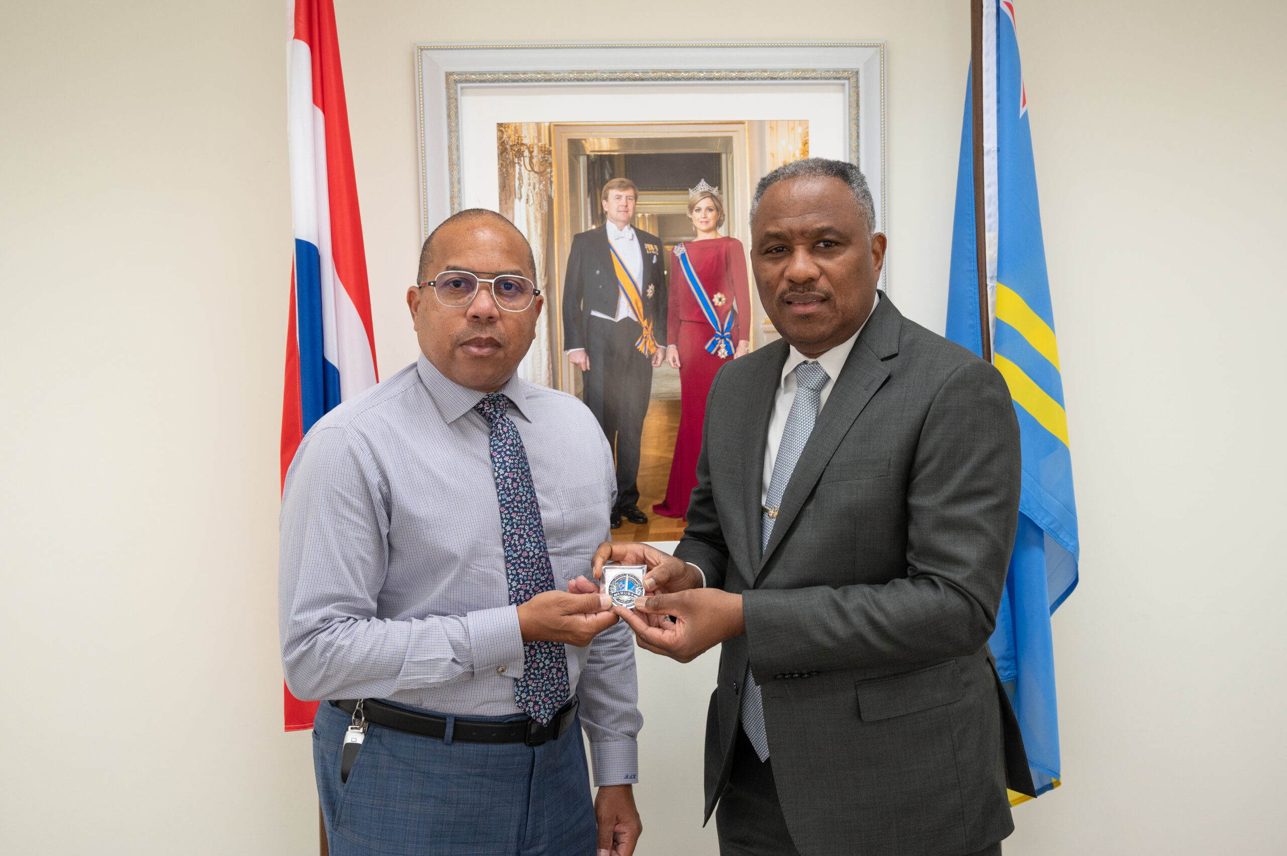 Kramers a entrega e moneda na e mandatario encarga cu Husticia na Aruba, mr. drs. A. Dowers, como un gesto simbolico di identidad y reconocemento di e rol importante cu e ministerio tin den fortalece e Cuerpo.